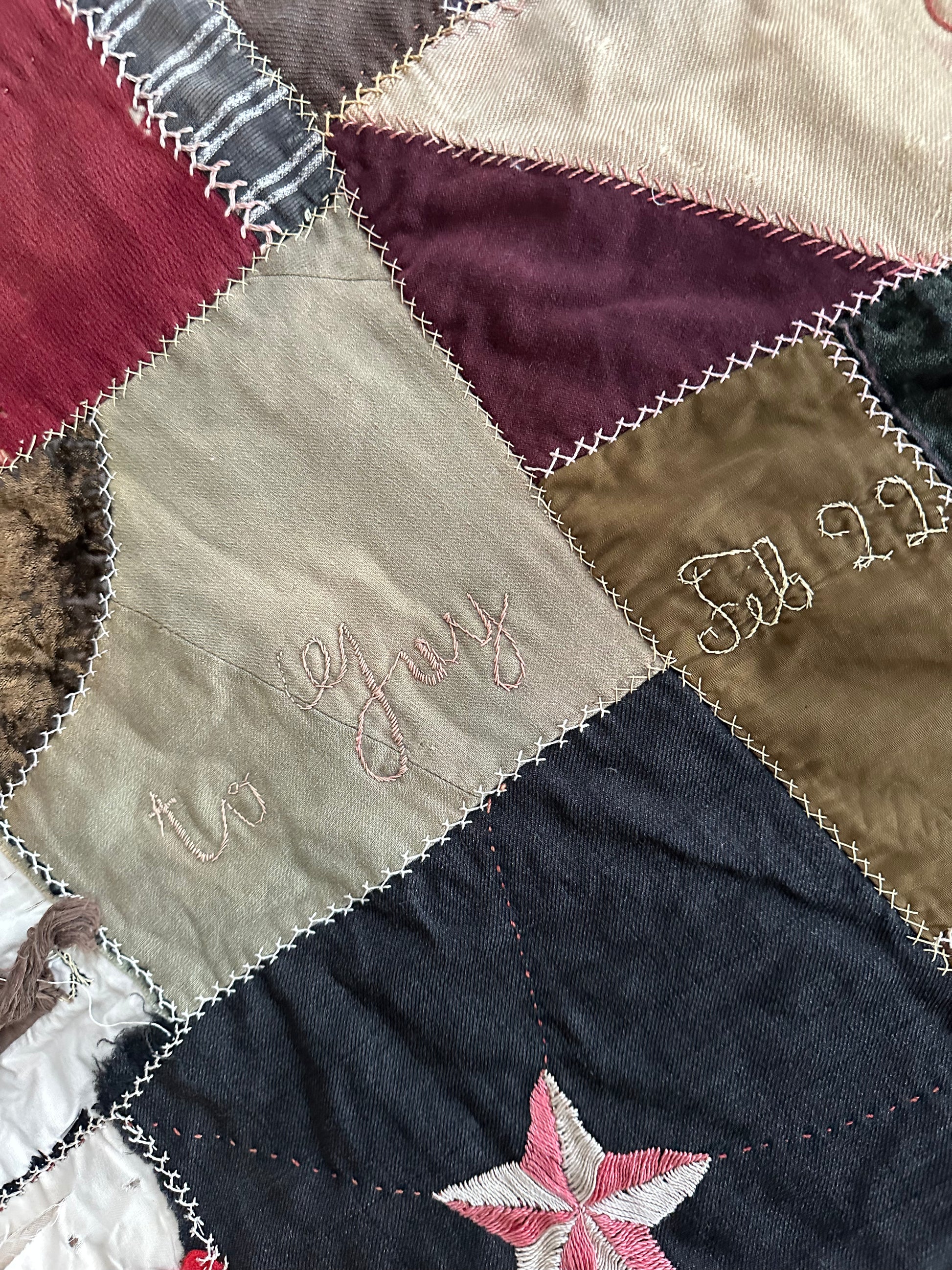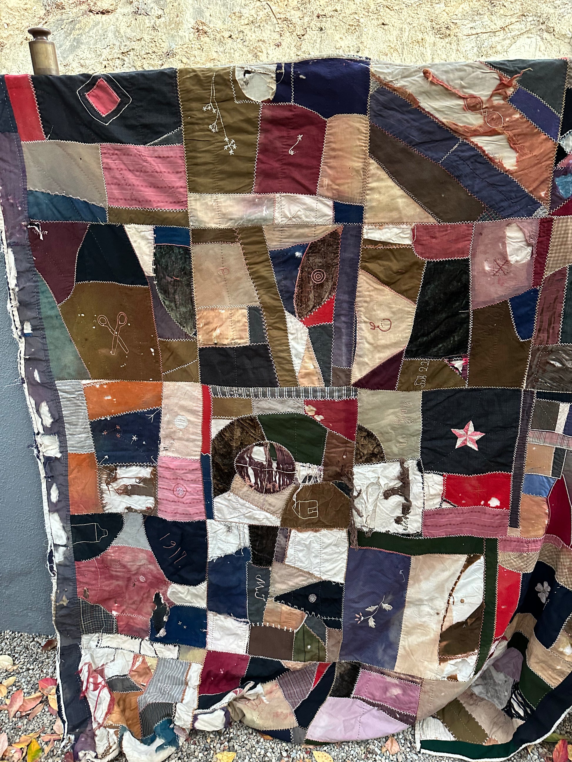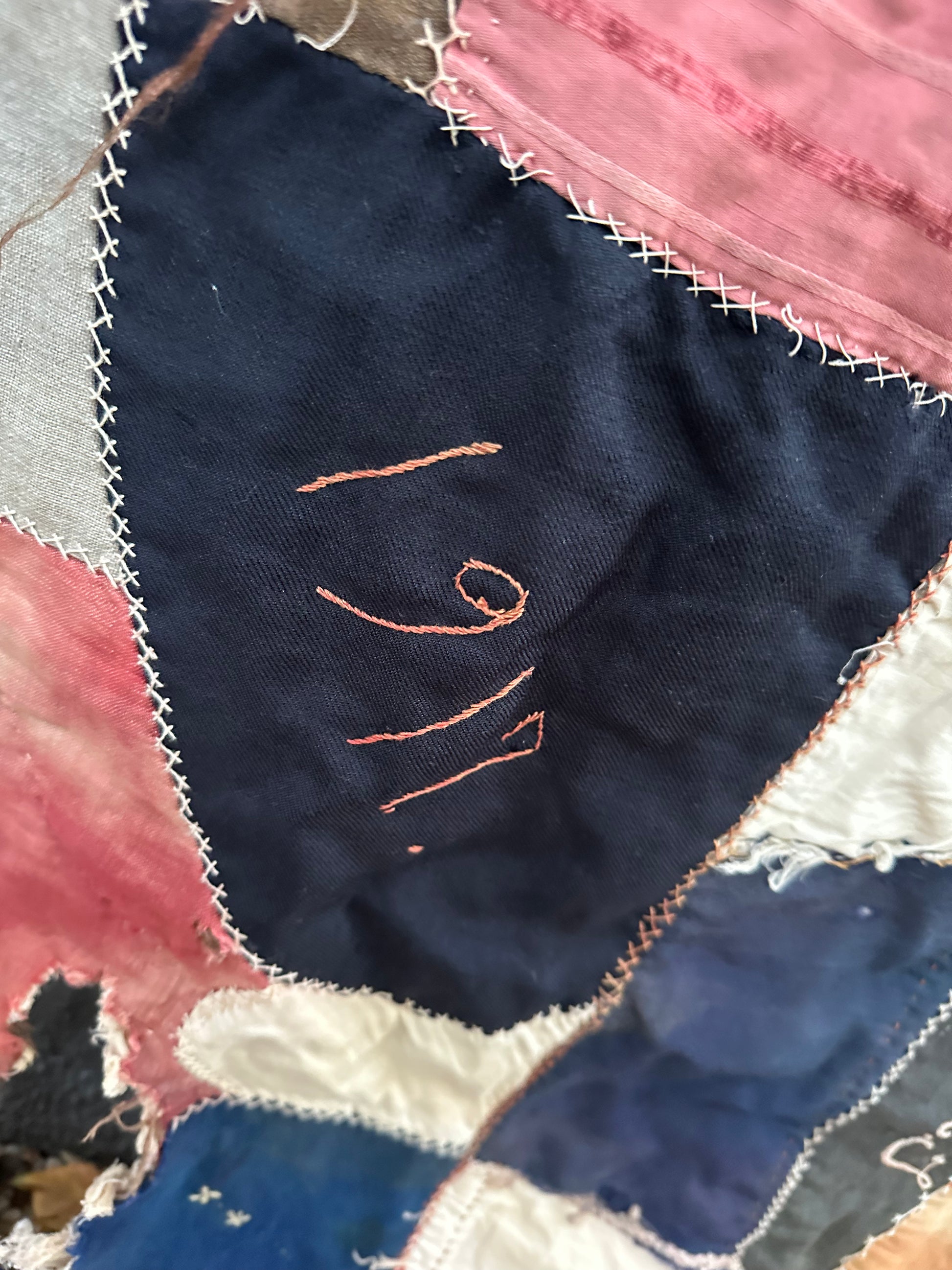 Wonderful 1917 Cotton hand stitched quilt. Very detailed with a ton of hand embroidered details. Embrace wabi-sabi. I will repair with vintage fabric scraps. Amazing Americana! Medium weight.