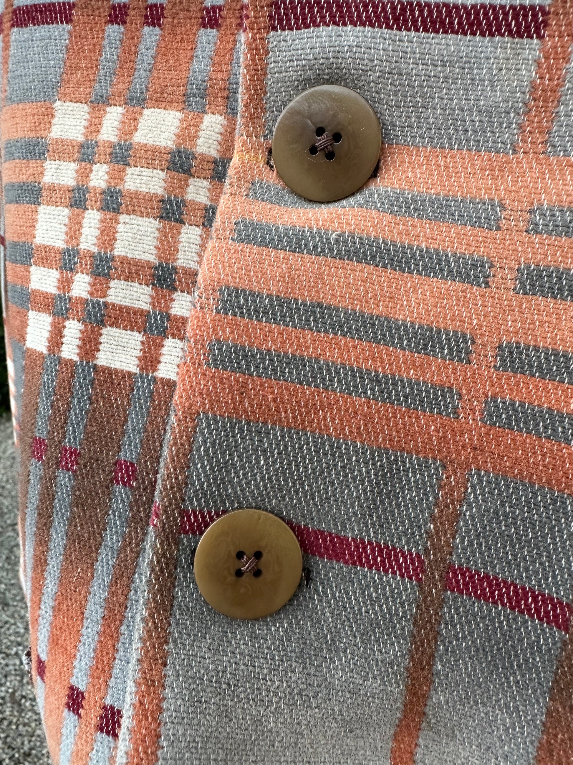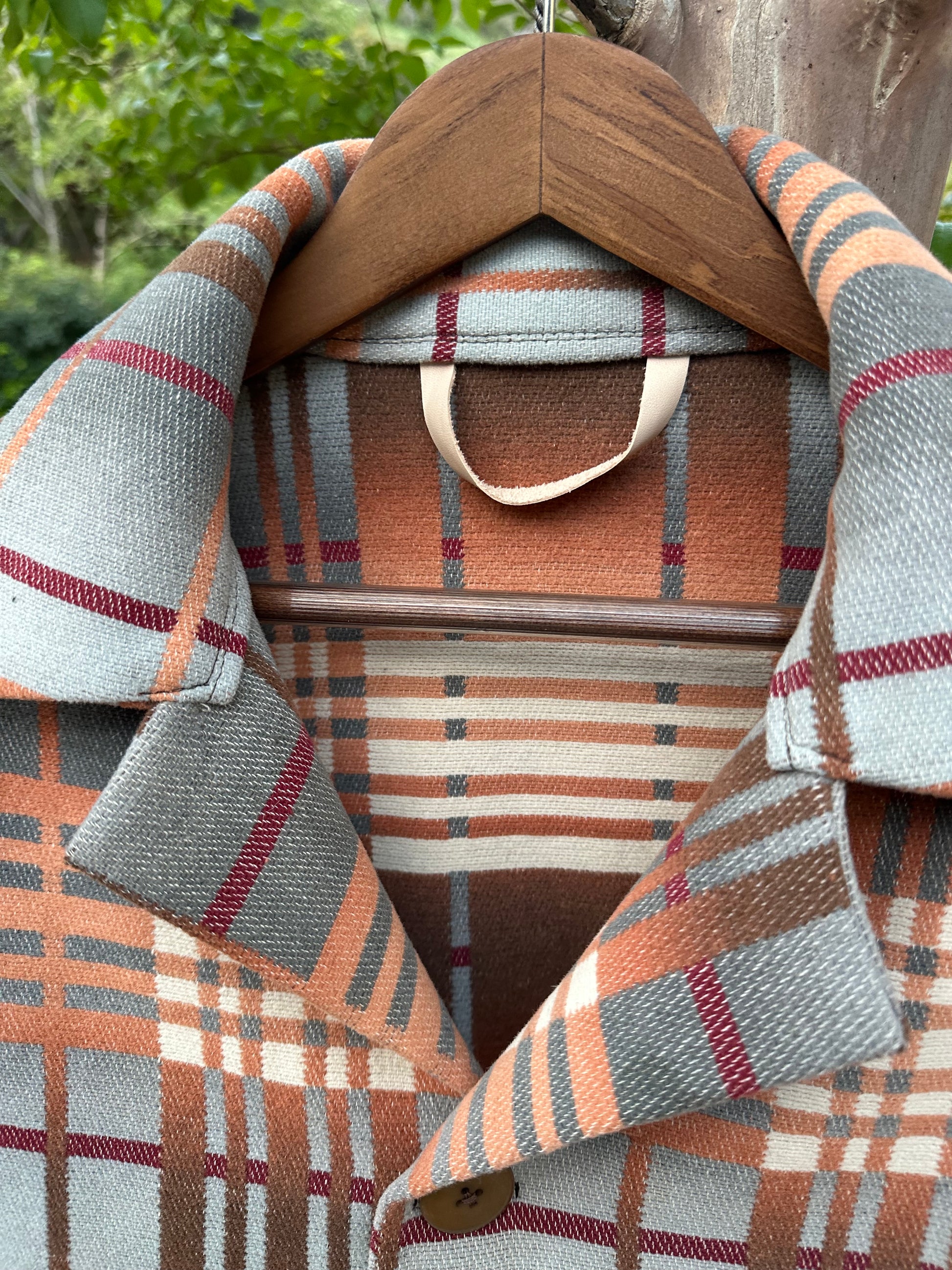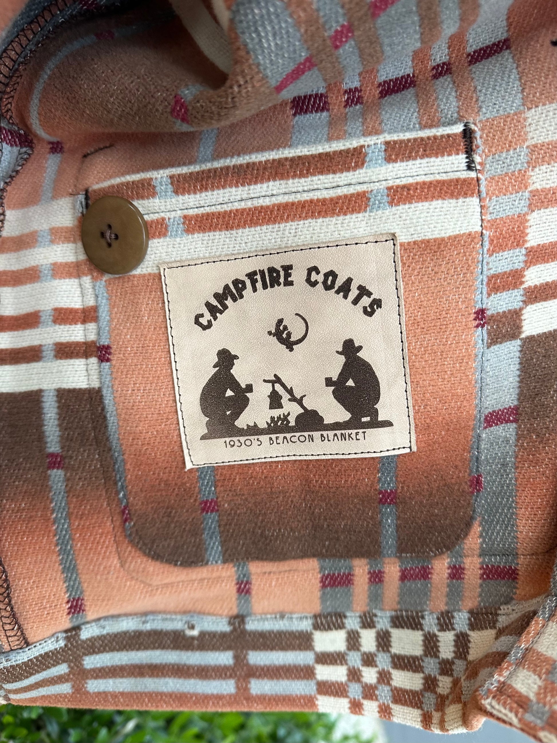 This Campfire Coat is crafted from a 1930’s Beacon Cotton Blanket. The blanket was perfect, except for a large hole right in the middle. Fortunately, I was able to cut around it and save this amazing textile. Ombre Blue Tan Creme Blanket. 100% cotton. Nice light weight. Exceptional condition. Still dense and solid. Features vintage Bakelite Buttons. Medium size. Likely never see another one of these in this nice of a condition.
