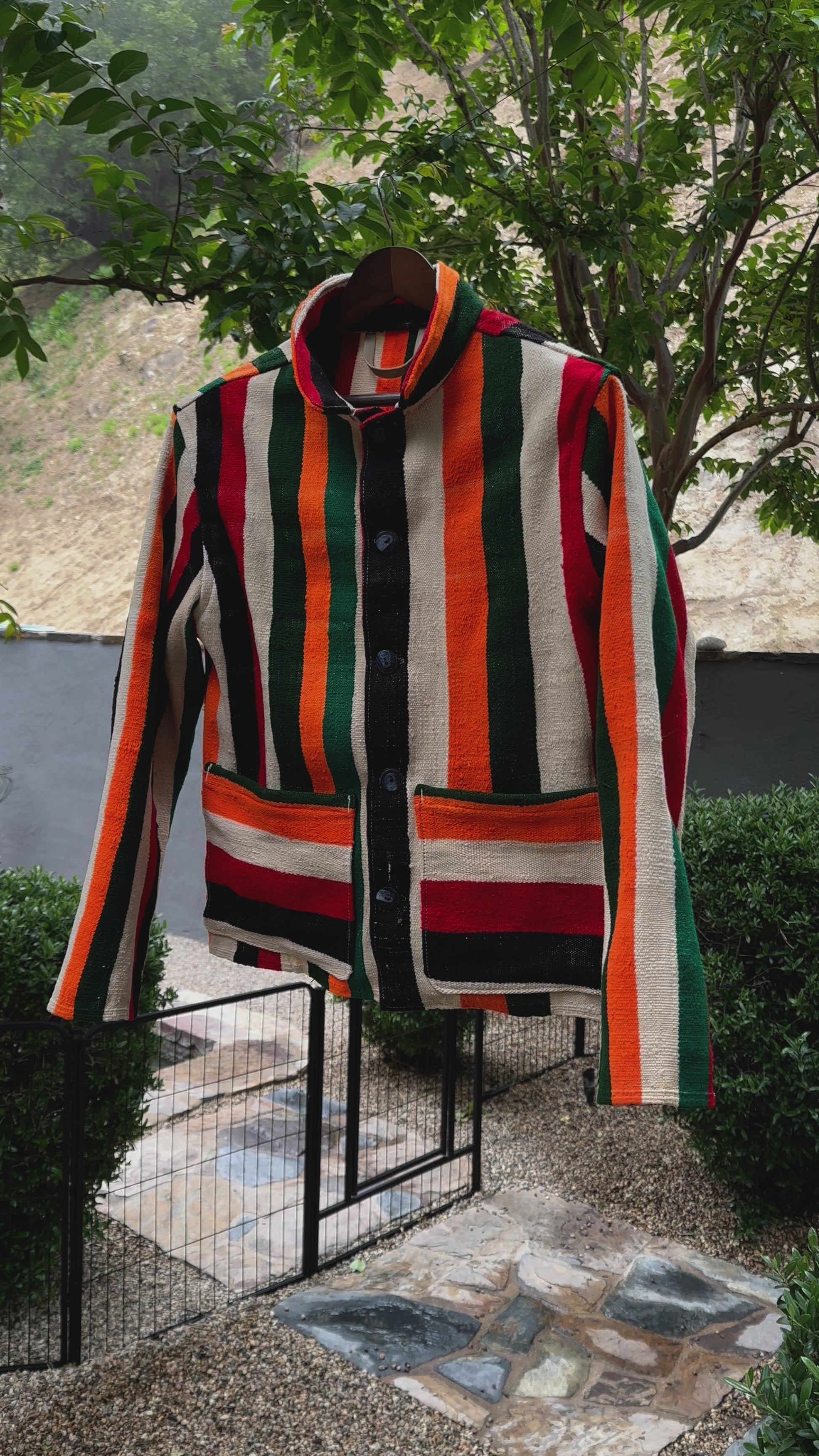 This! 1950’s Moroccan Berber Cotton Campfire Coat with a Nehru collar. Wonderful material, hand woven. Unique vintage buttons. Size is medium. One of one!