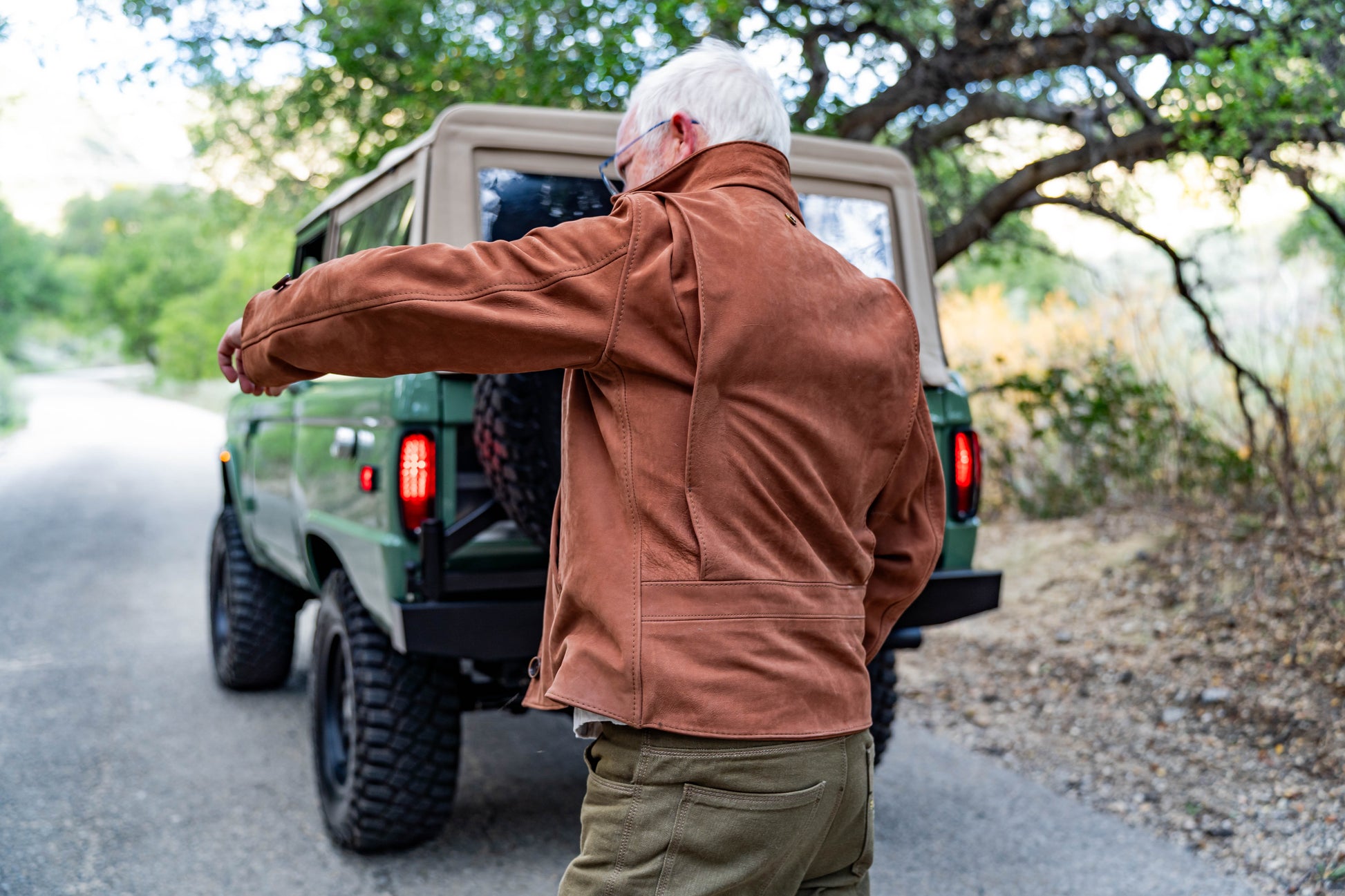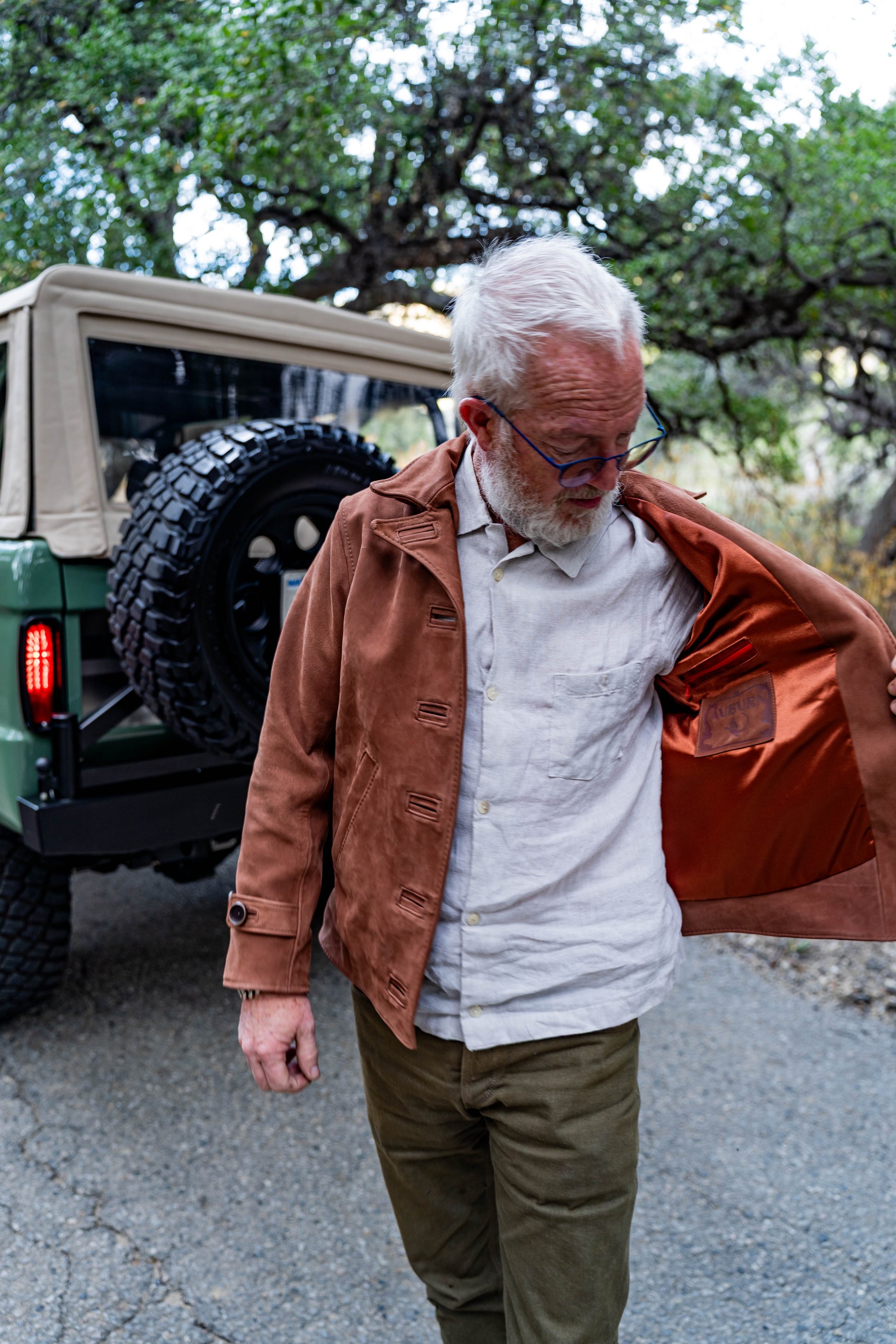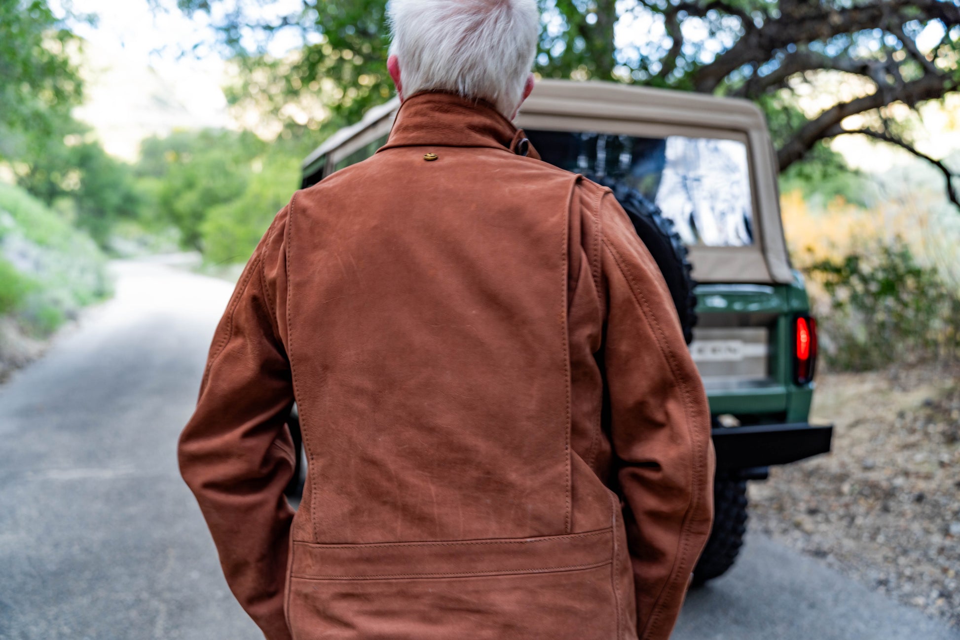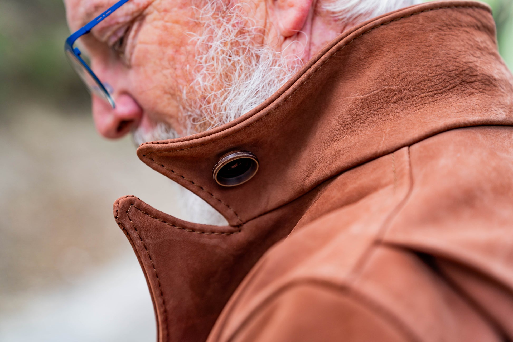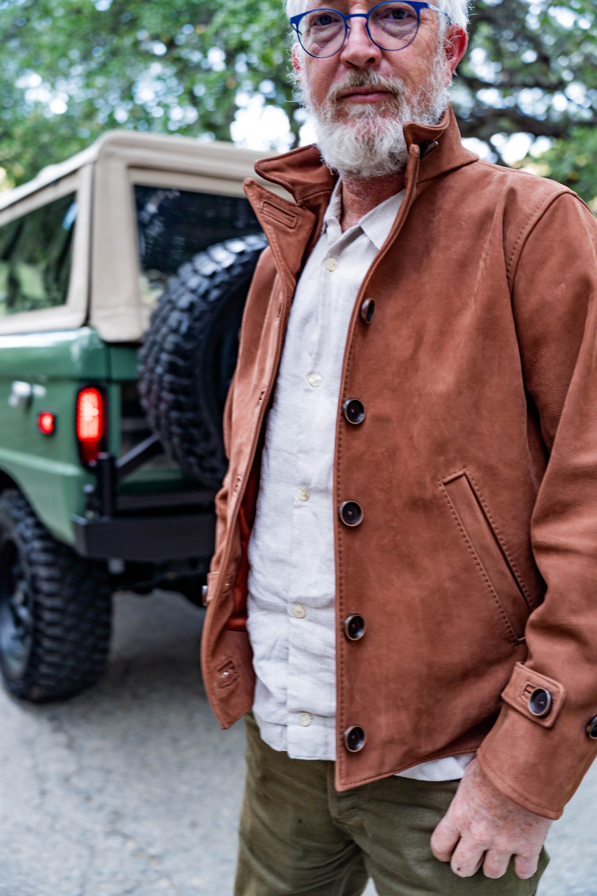 This is the Auburn Leather Jacket, inspired by pre-WWII designs. Crafted in high quality italian Nubuck leather. Fully lined in silk. One inside pocket with zipper. Back vents, adjustable sleeve tethers. One of one!