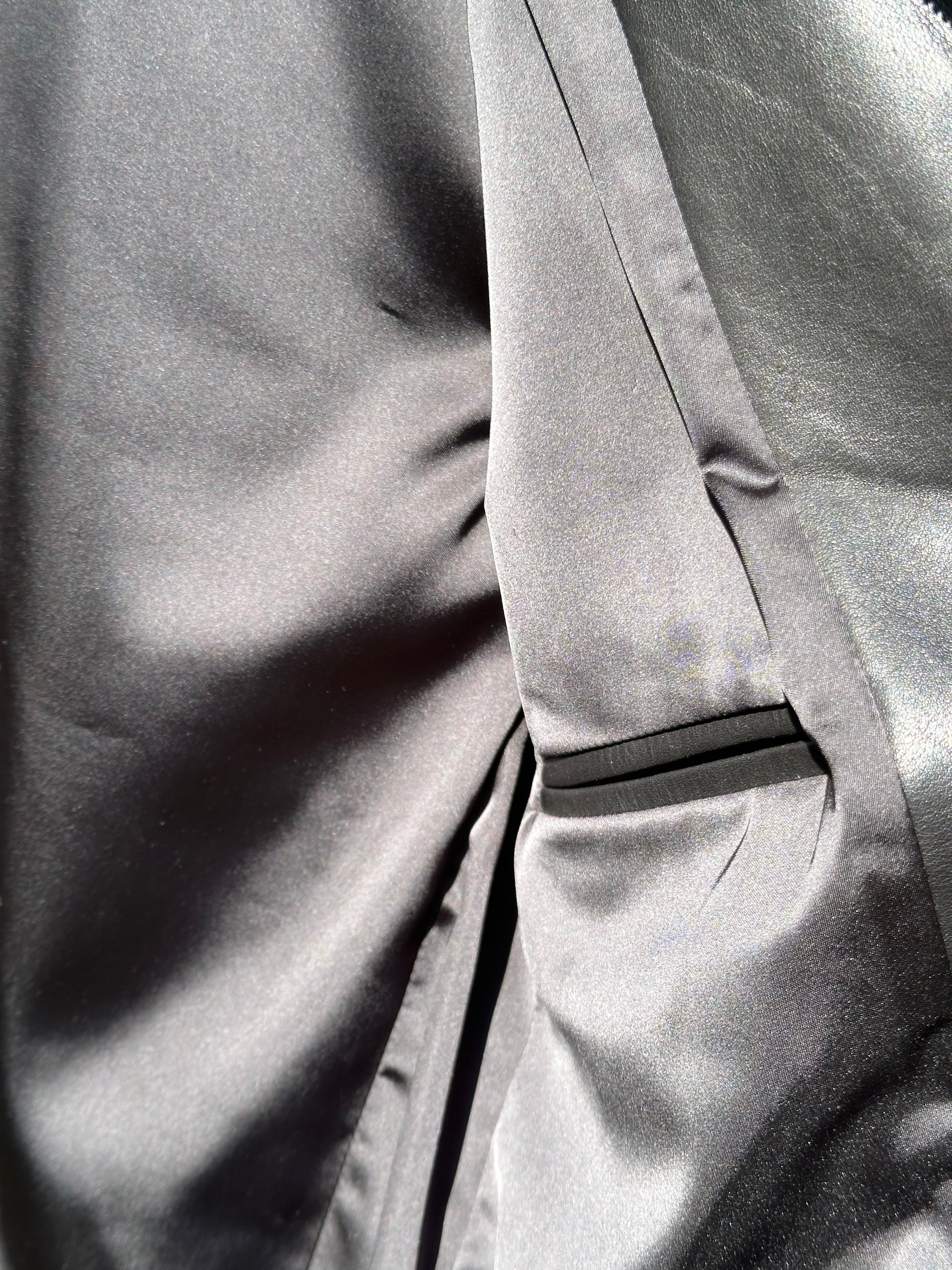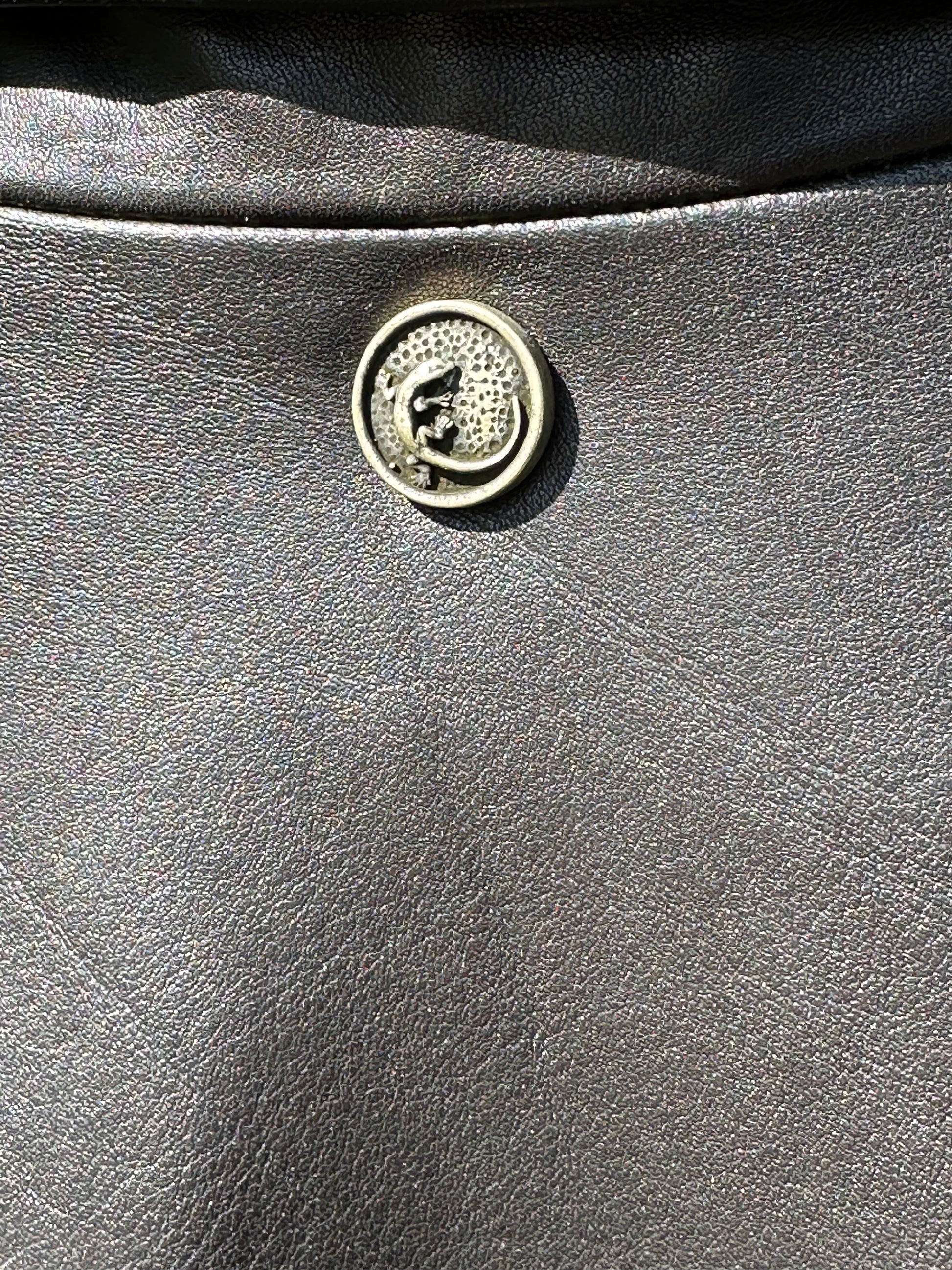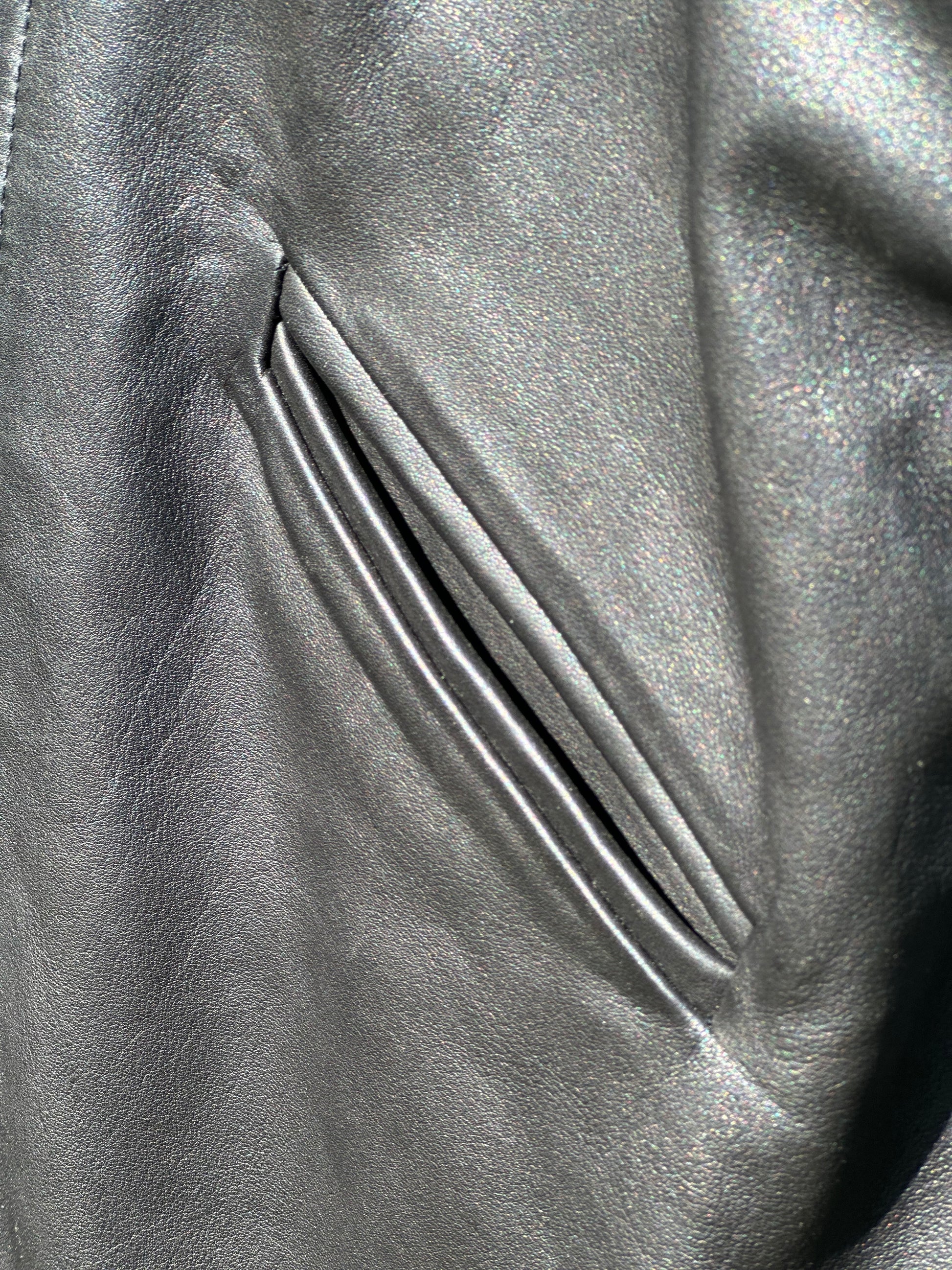Beautiful black leather 1950’s style leather jacket, fully ined. RiRi brass zipper. Sterling silver badge on back. Size Medium. One of one!