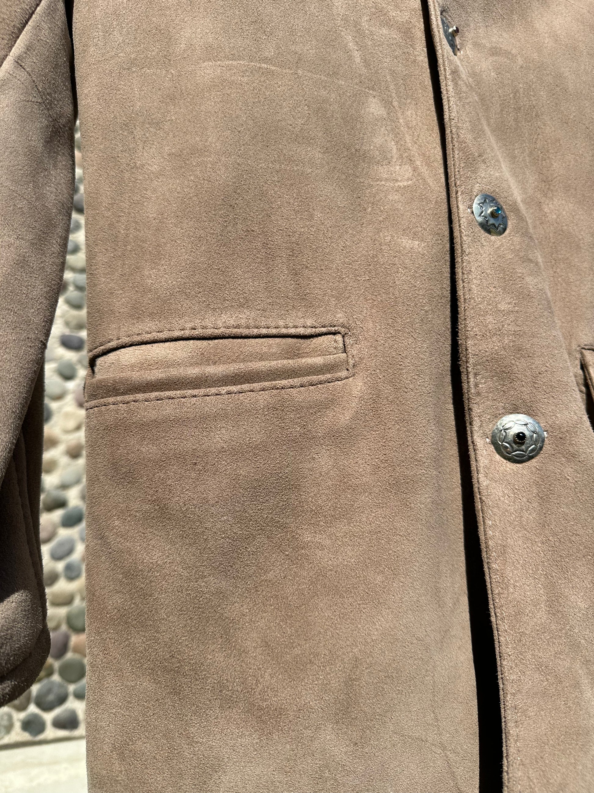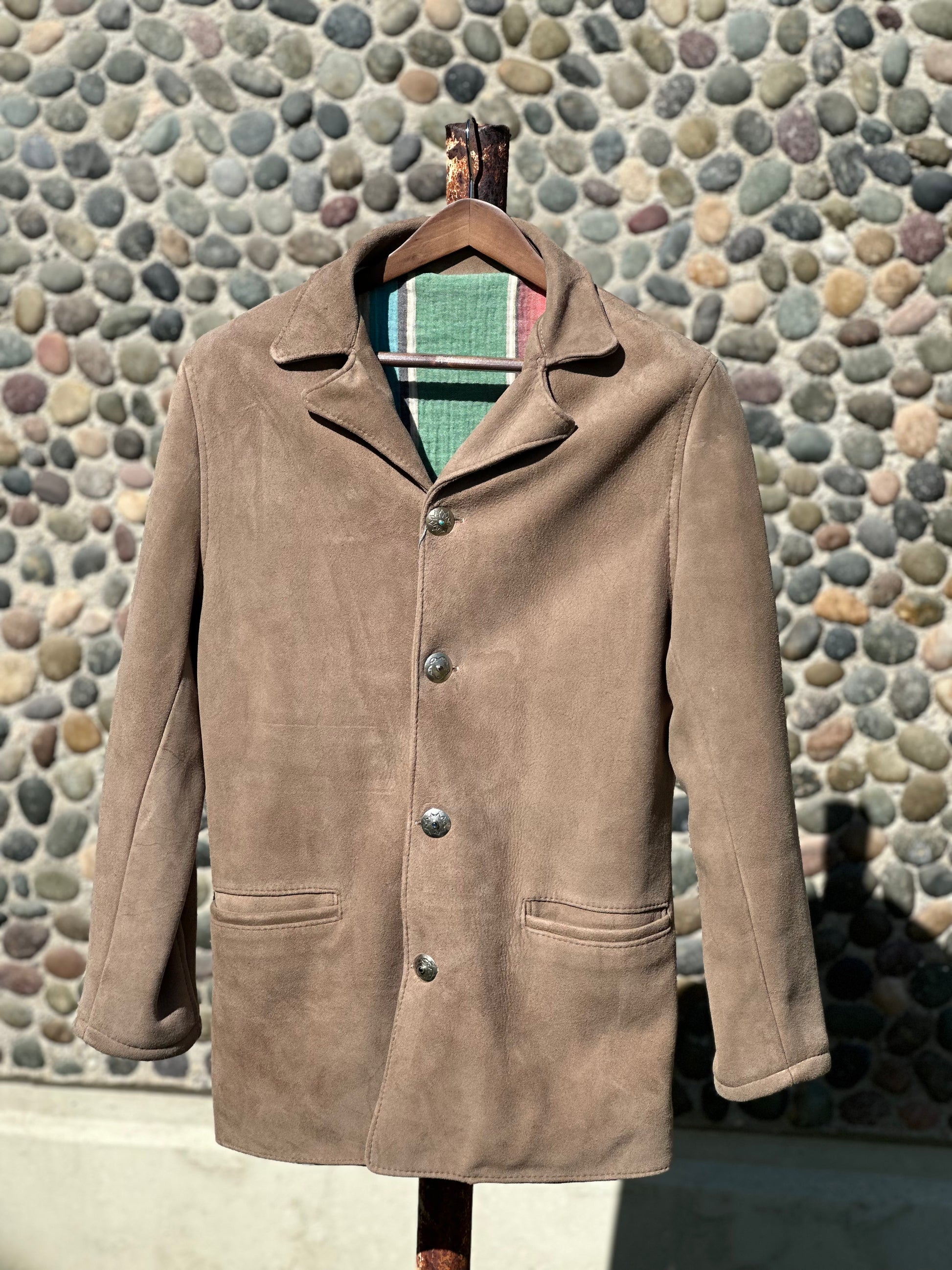 Brain Tanned Deerskin Ranch Coat. Tanned on an Indian reservation in New Mexico in the ancient traditional manner. Lined in El Cosmico cotton. 1950’s Native American sterling silver and turquoise buttons. Size Medium. One of one!