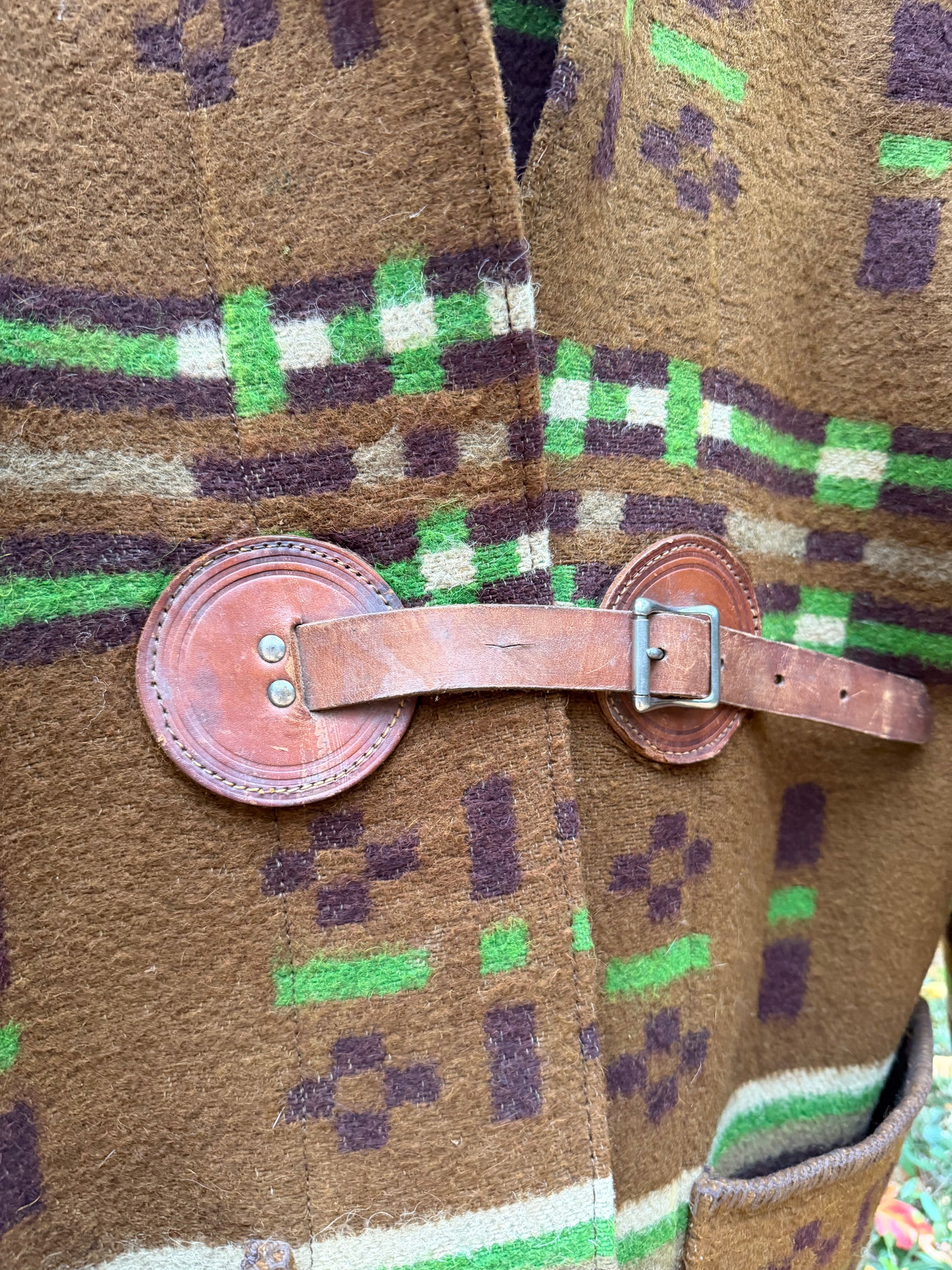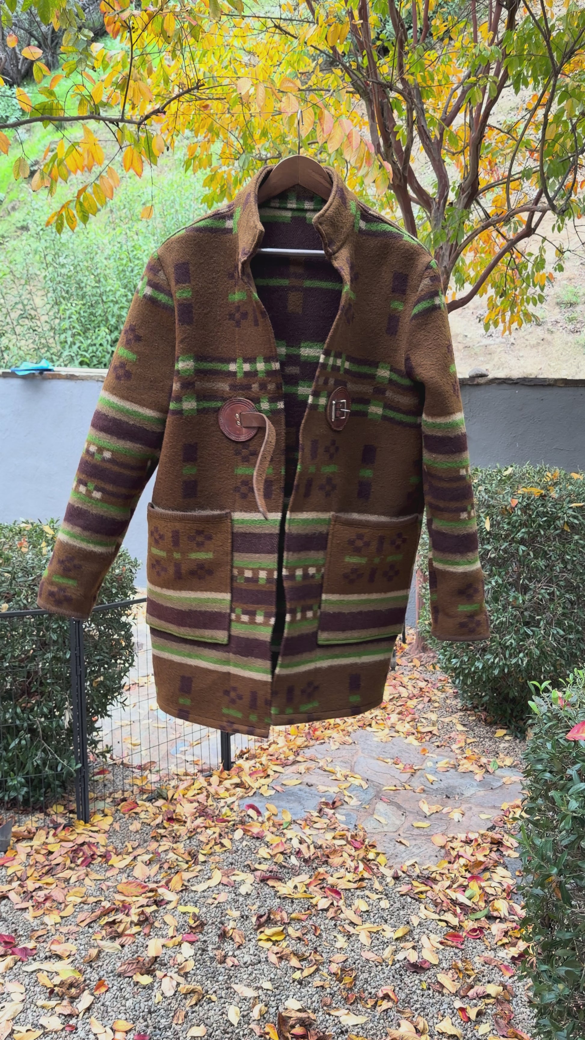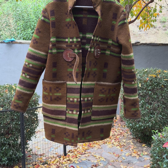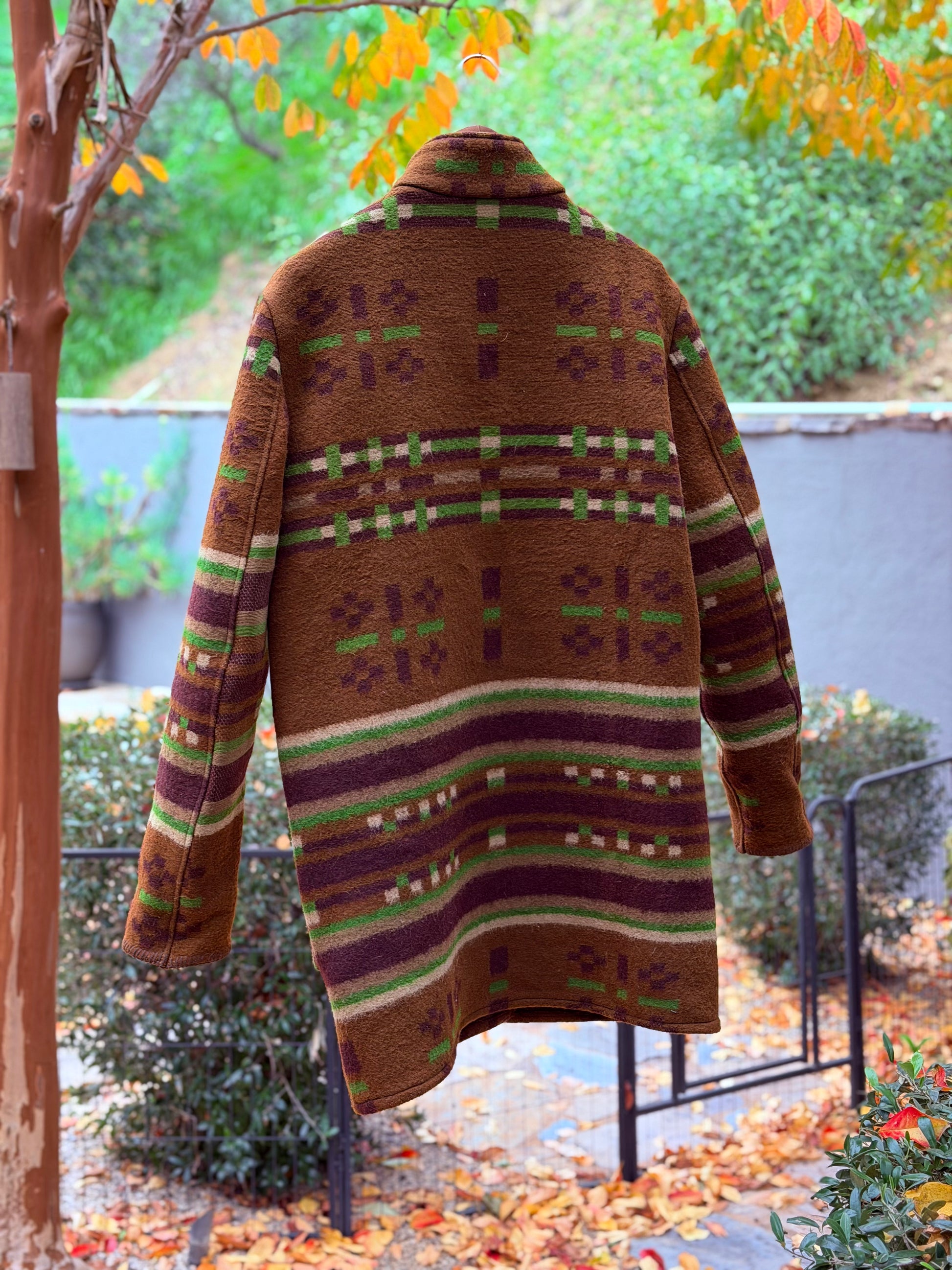 This is the fourth version of my new long coat cut. This time I did it in an exceptionally rare 1800’s Jacquard woven wool horse blanket with original leather hardware. Two large exterior patch pockets lined in silk. One phone friendly inside left pocket. Wear a piece of history! One of one! Size is men’s large.
