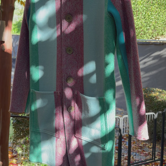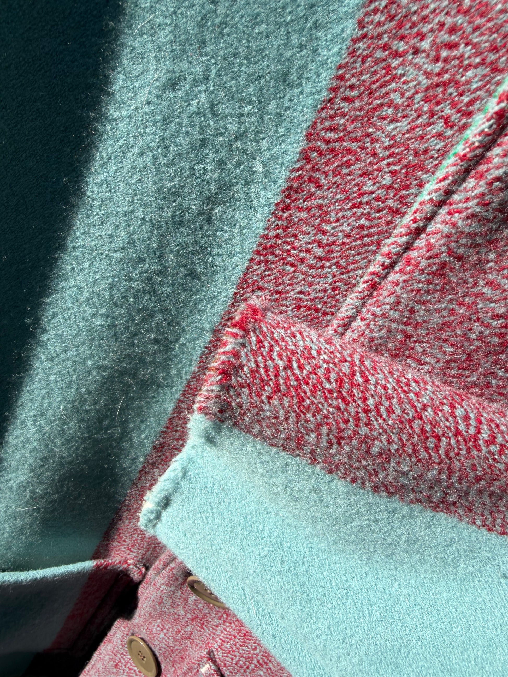 This is the third version of my new long coat cut. This time I did it with new Pendleton “Weavers Choice” Marino wool. Uniquely soft and dense weave for Pendleton. A little known fact about Pendleton is that at the end of the day, if the quota has been met, they let the weavers choose what to do with the leftover wool! This results in one of a kind weaves that are never repeated. Each is done just once. Vintage buttons, leather hang tag and two large exterior patch pockets. One phone friendly inside left pocket with a spare button! One of one!