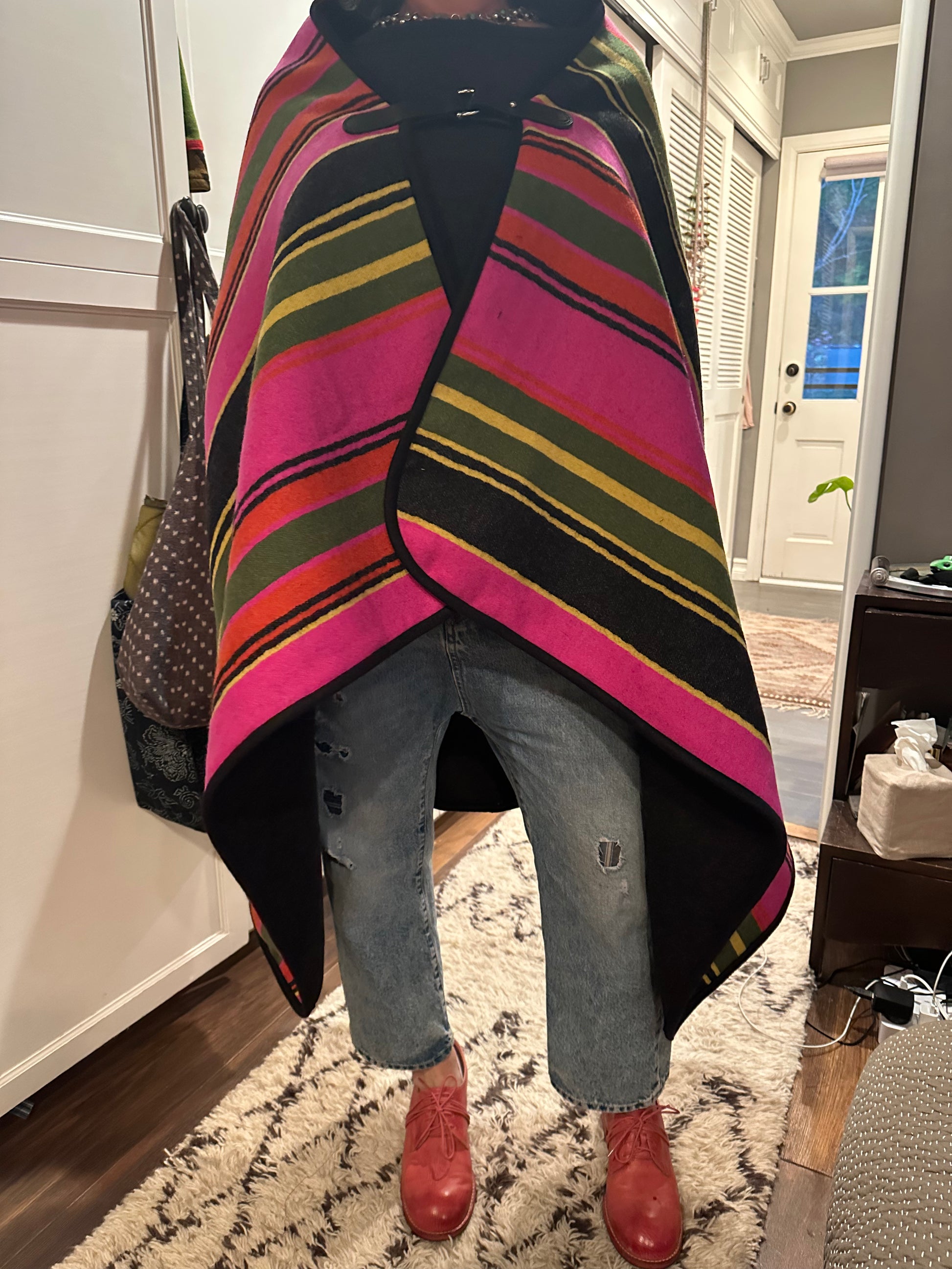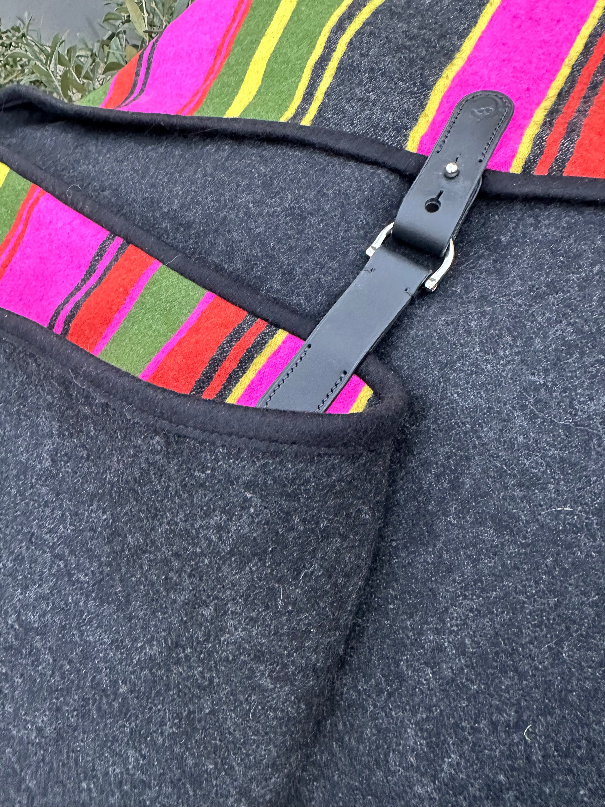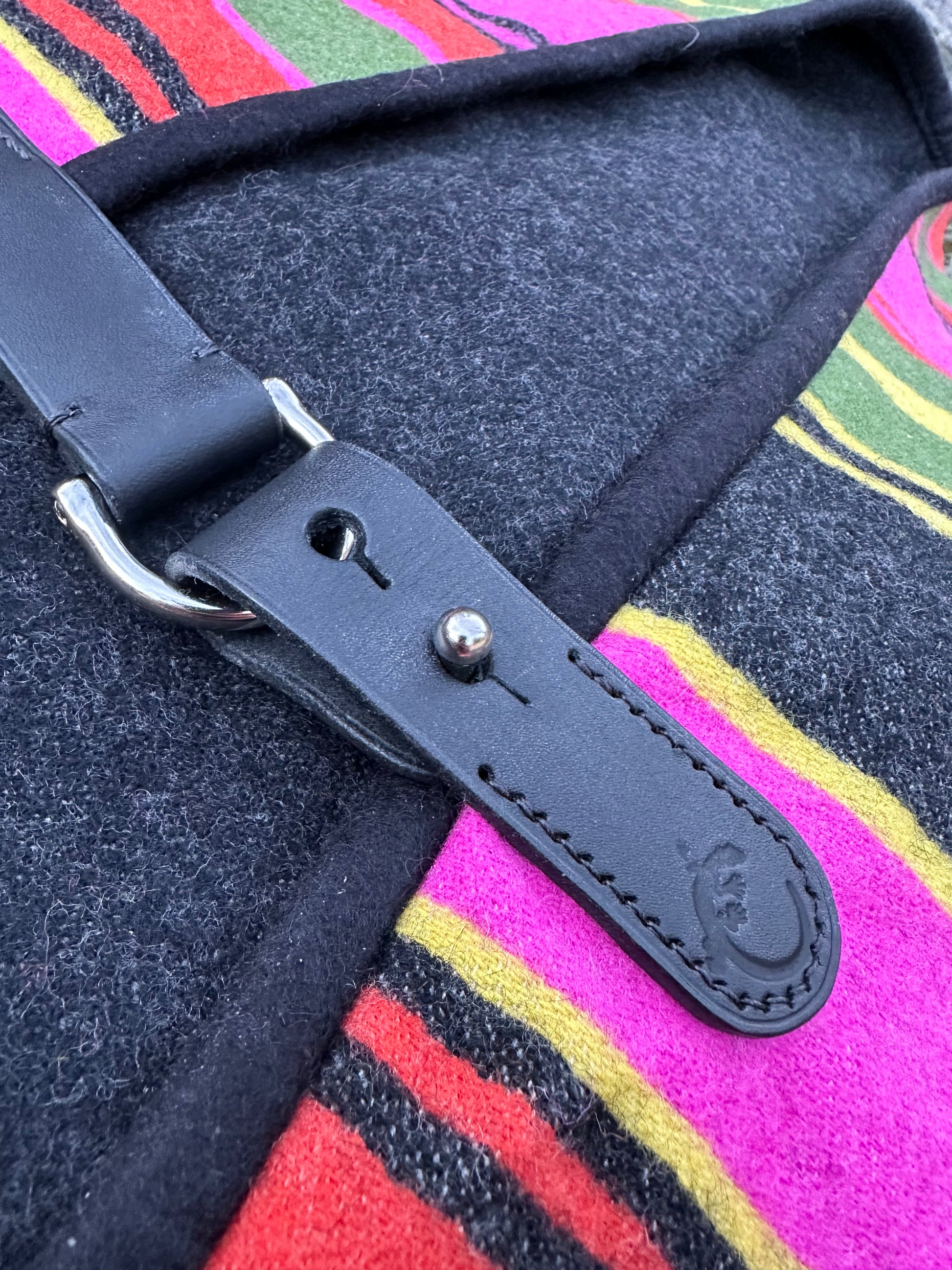 Everyone has been asking me to develop a poncho, so here you go! Campfire Poncho Jacquard D Squared Rare remnant wool. Open front with hand burnished fine English Veg tanned leather and nickel plated brass hardware. Pendleton black wool edge binding. One size fits all!
