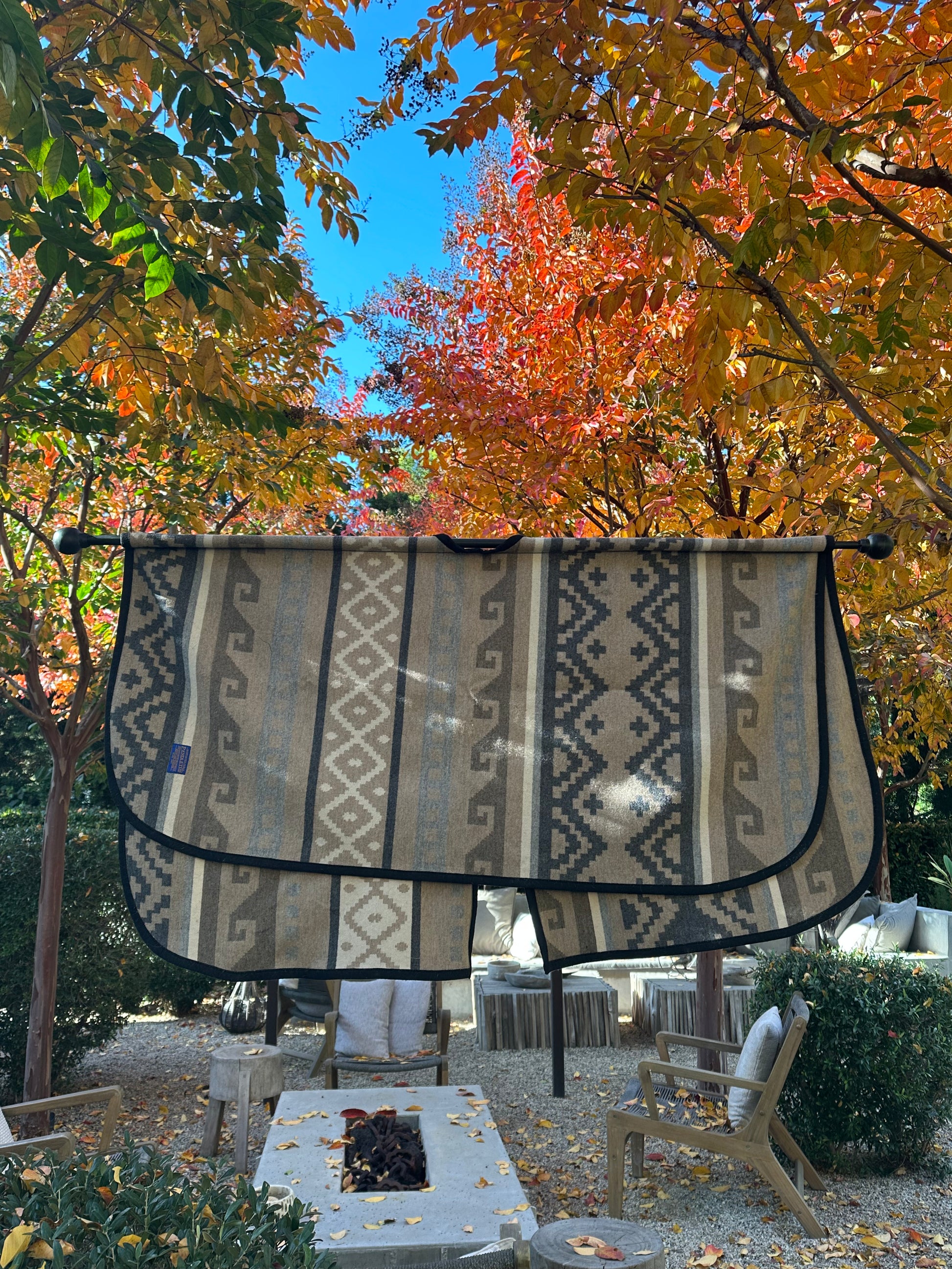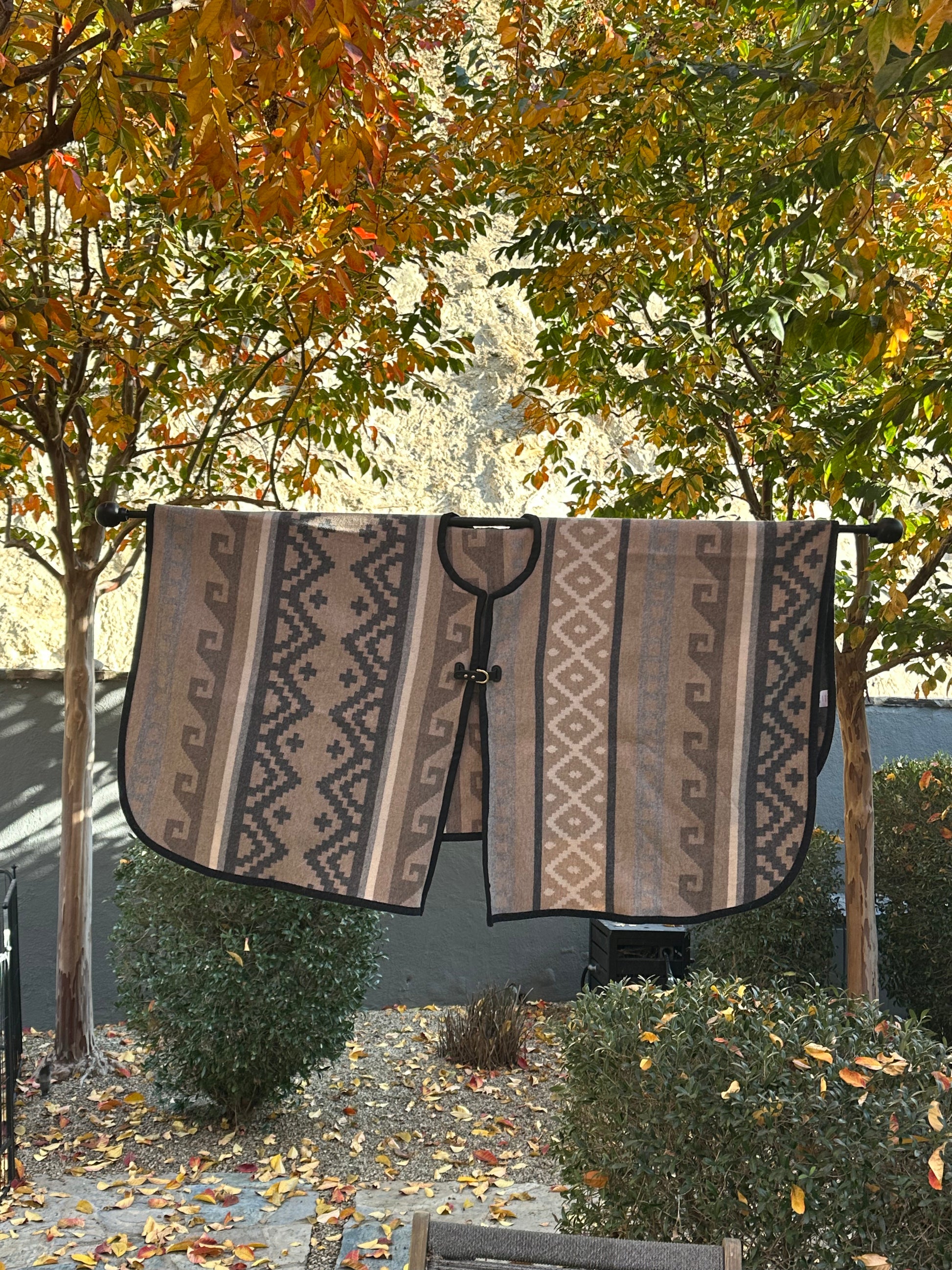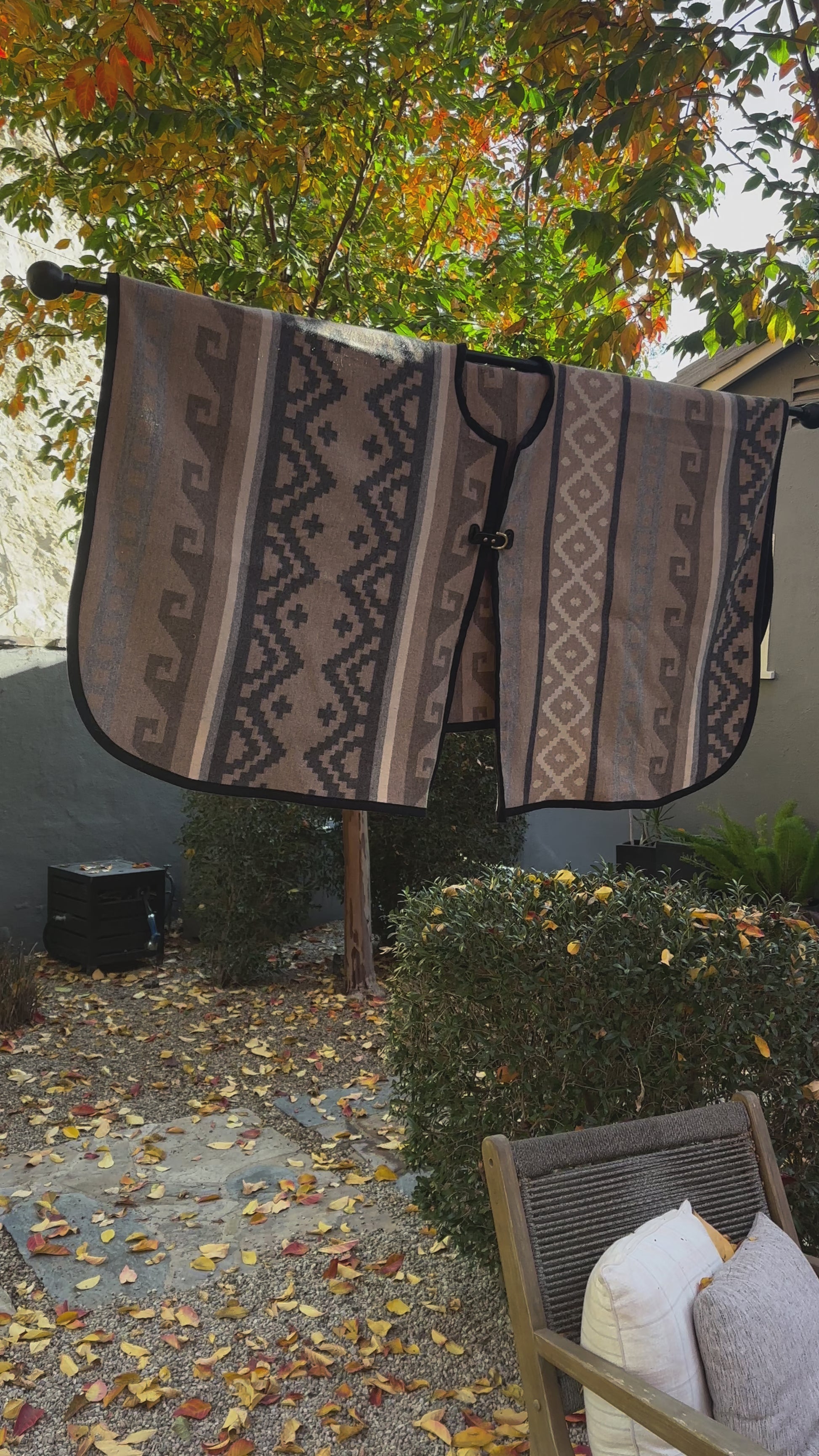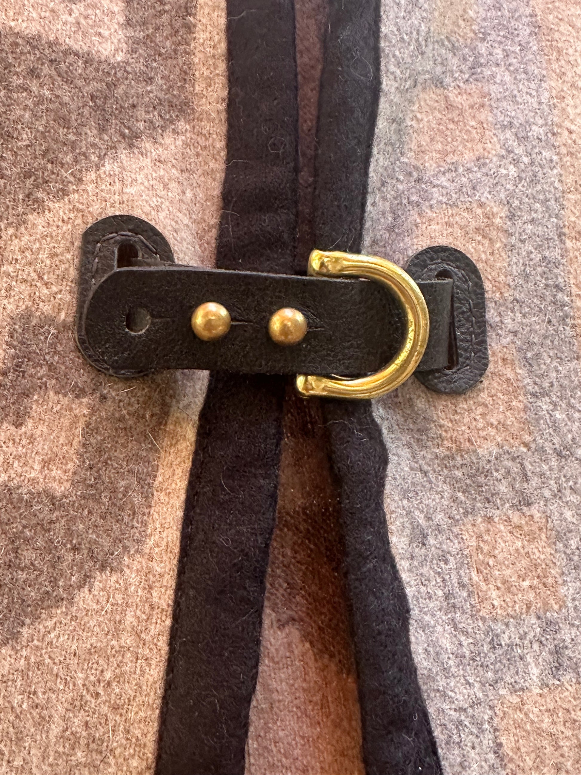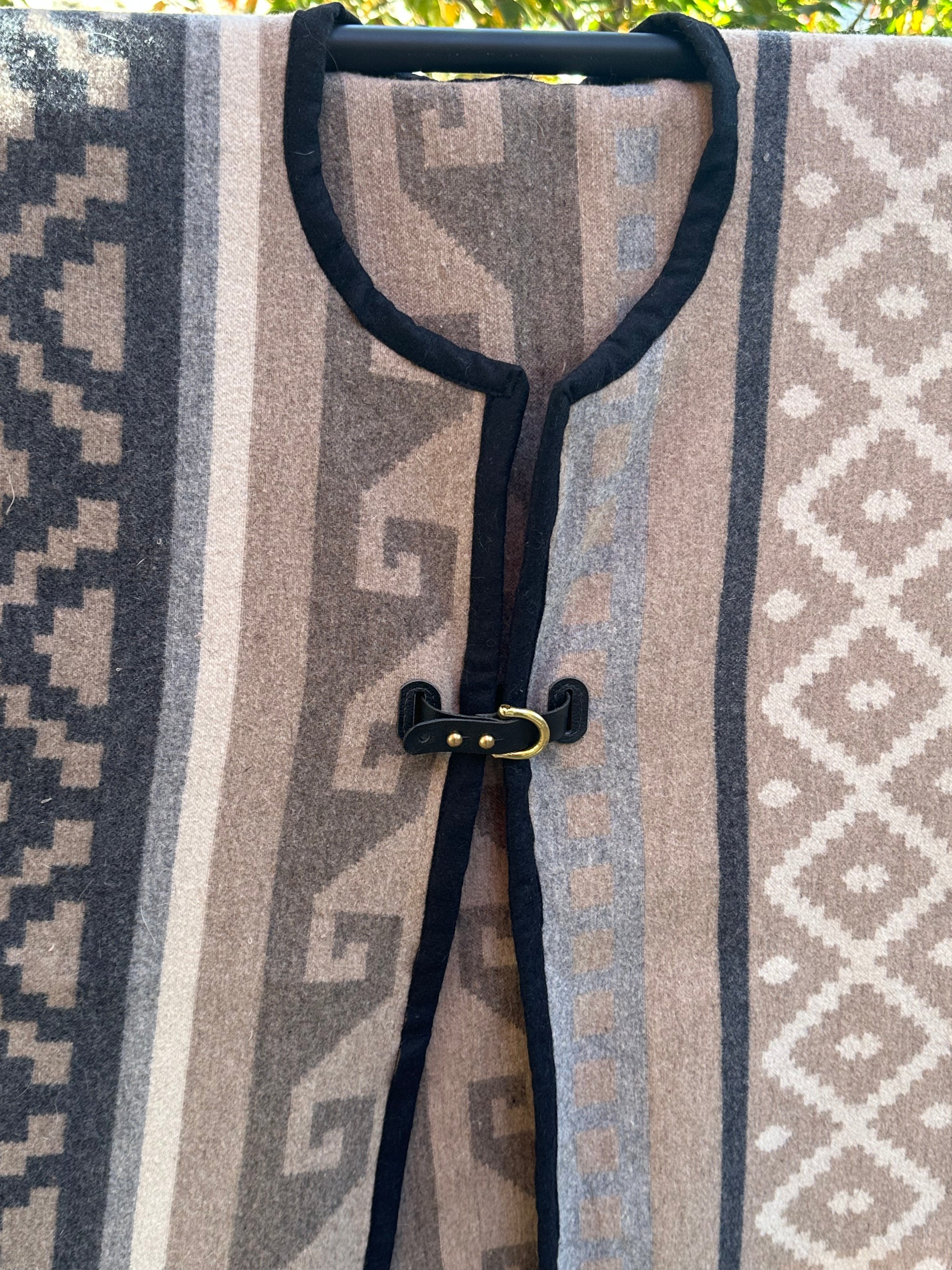 Everyone has been asking me to develop a poncho, so here you go! Open front with vintage leather & brass closure. Reversible. Crafted from a rare vintage Pendleton® Jacquard Wool blanket, with rounded corners. One size fits all!