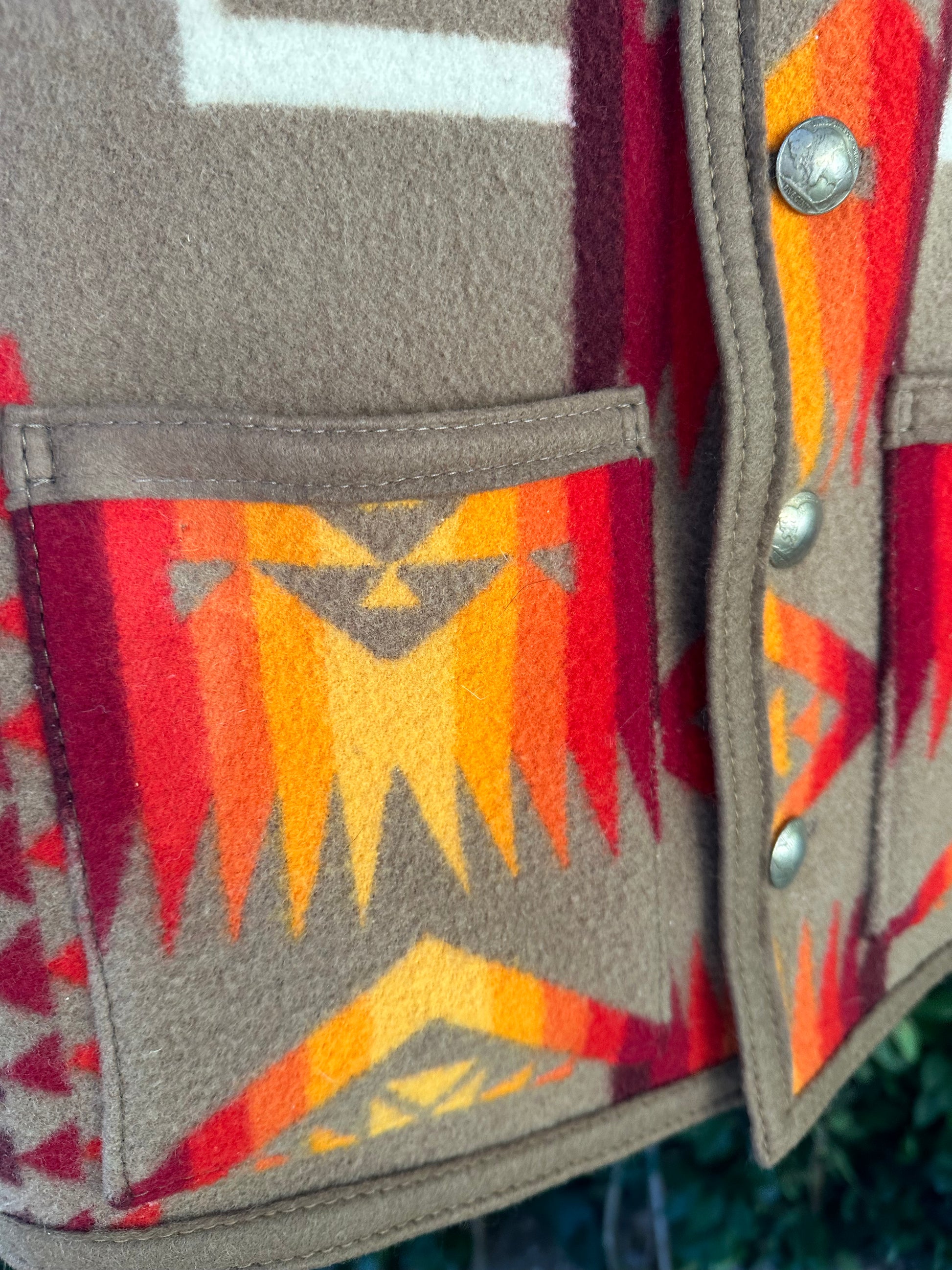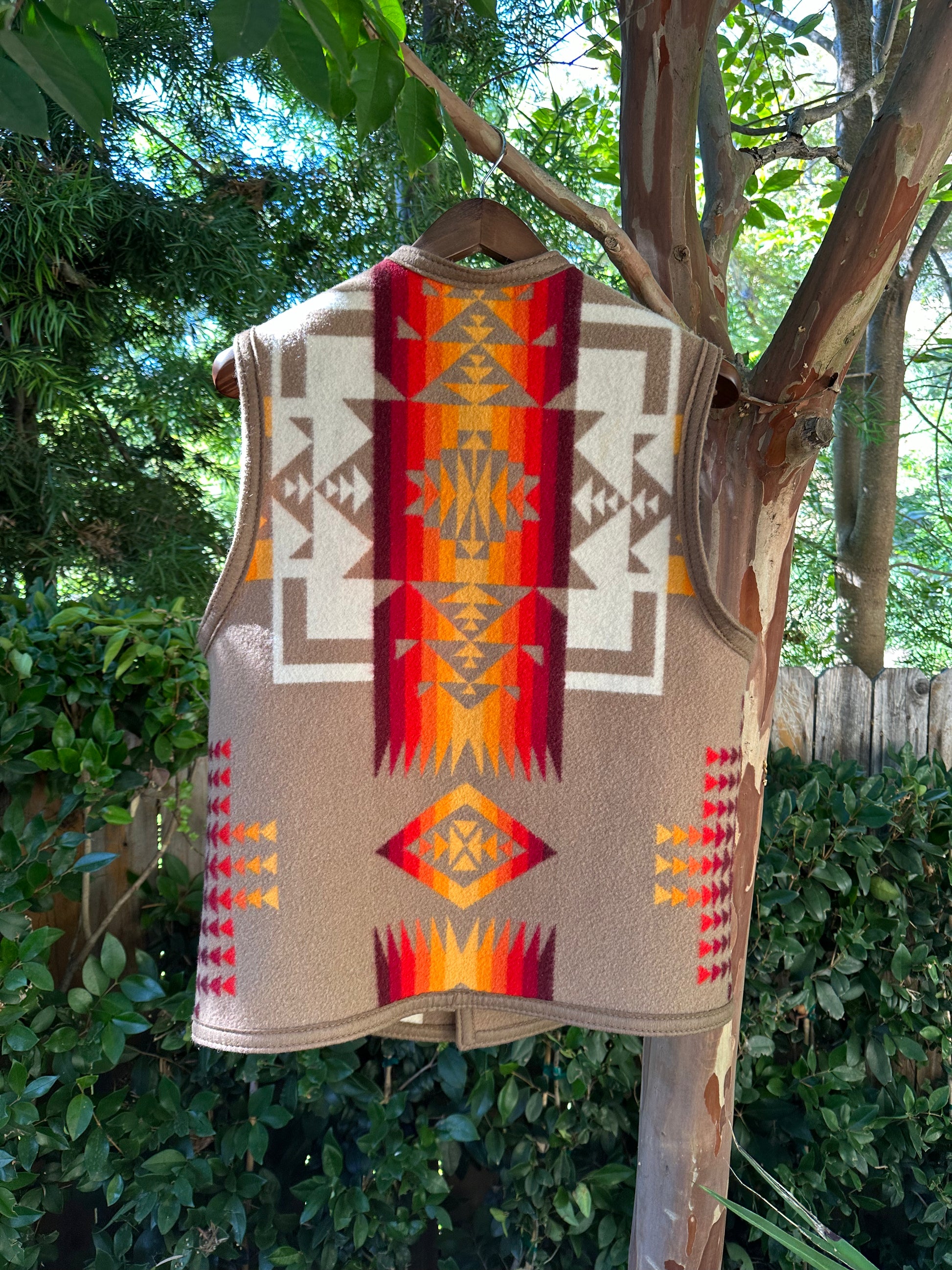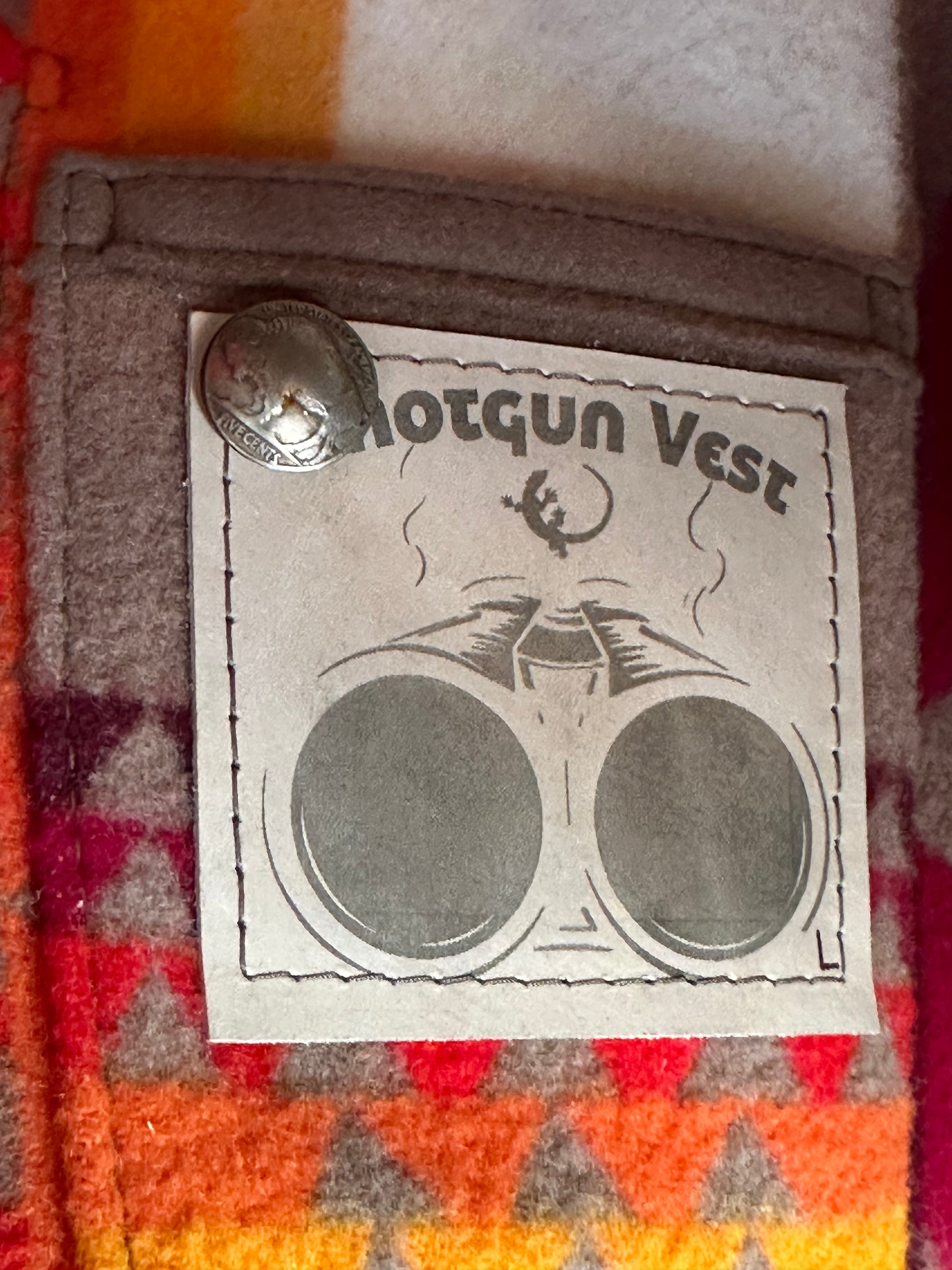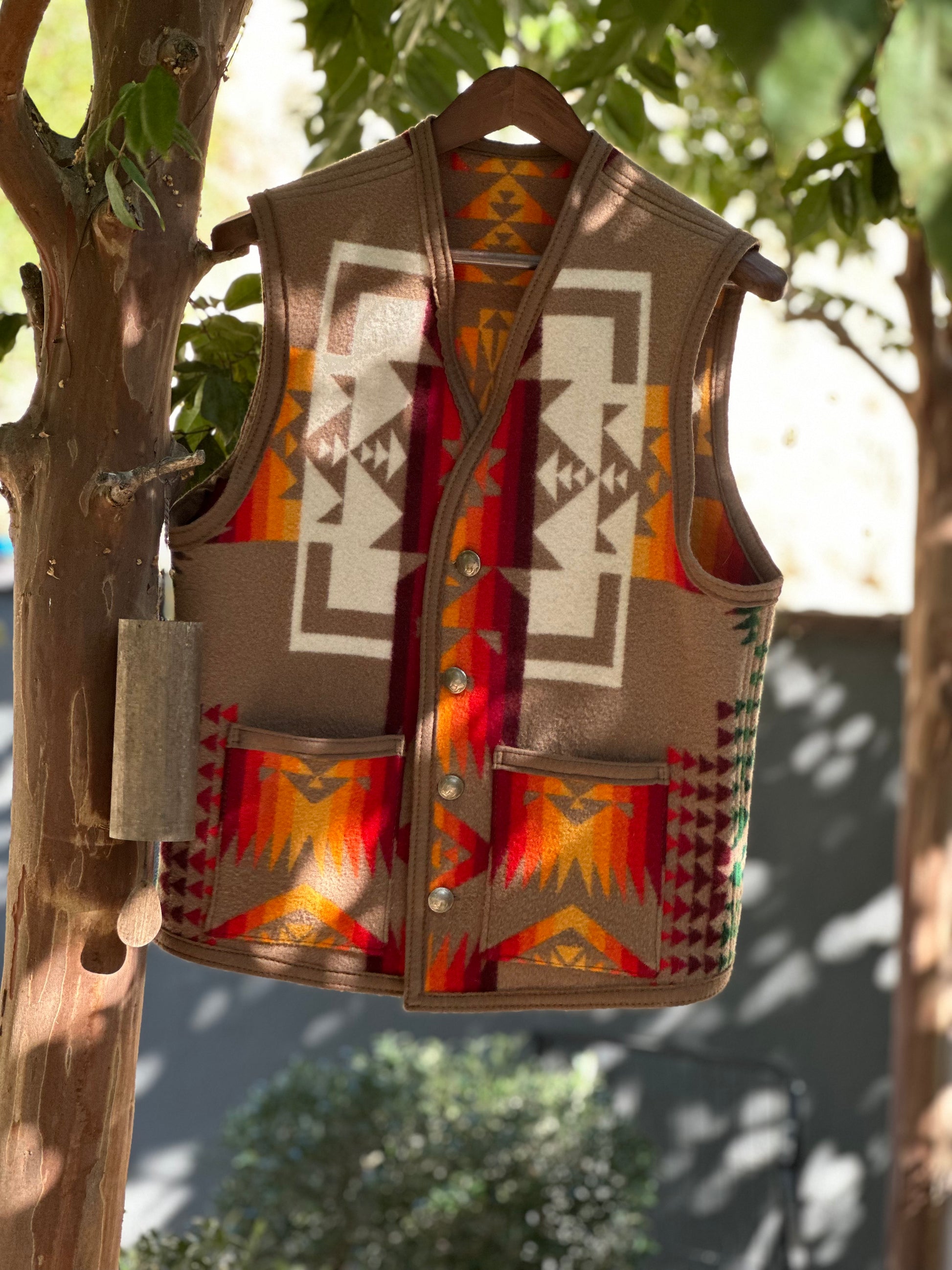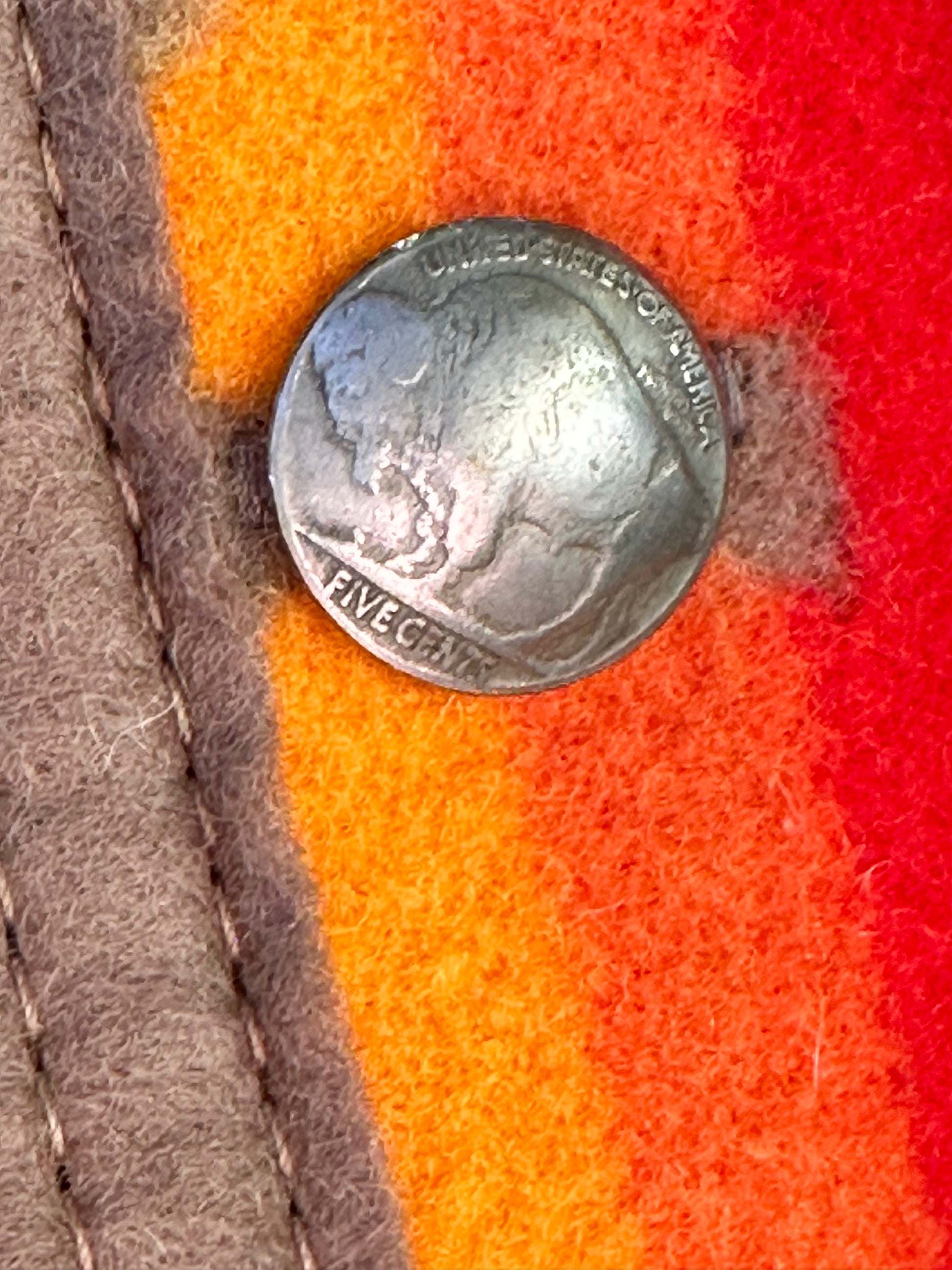 This Campfire Vest is crafted from a vintage Pendleton® Chief Joseph blanket. Size men’s Large. This is my “Shotgun Vest” pattern, which is best for stocky and muscular body shapes. Silver Buffalo Nickel buttons. One-of-One.