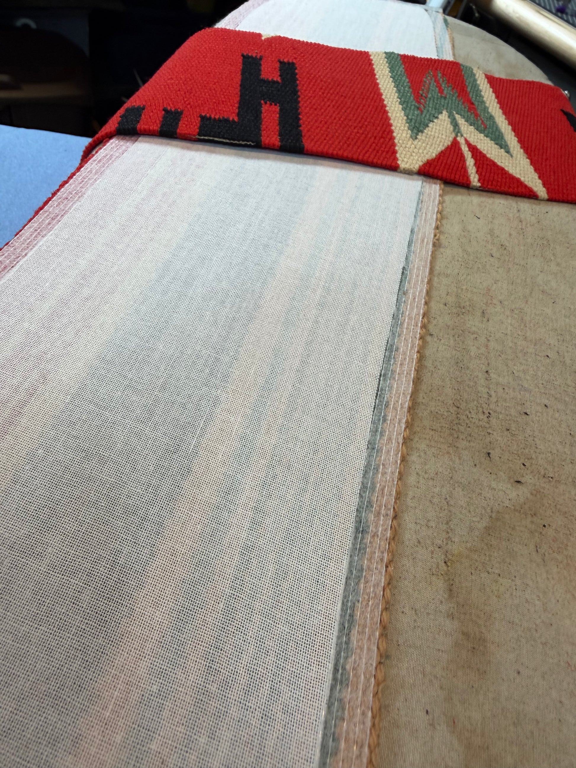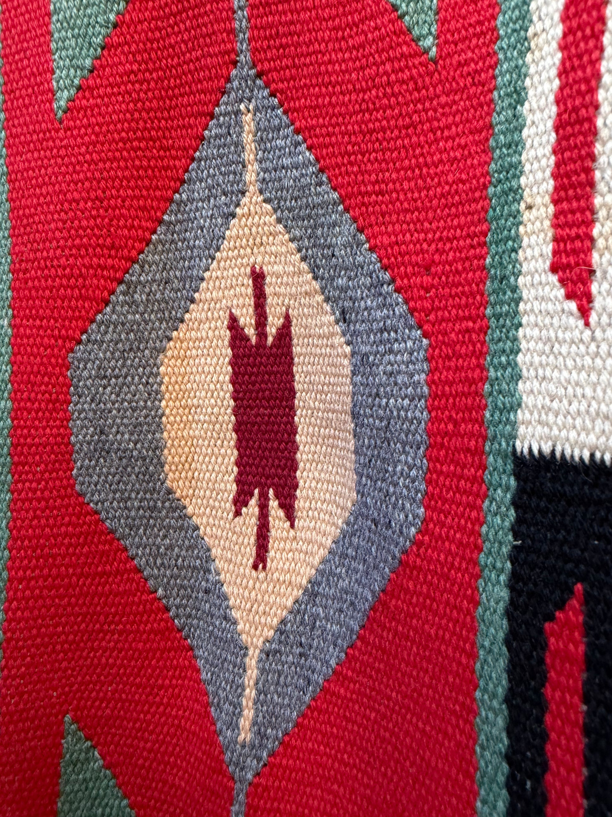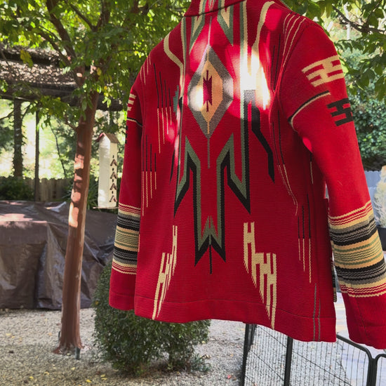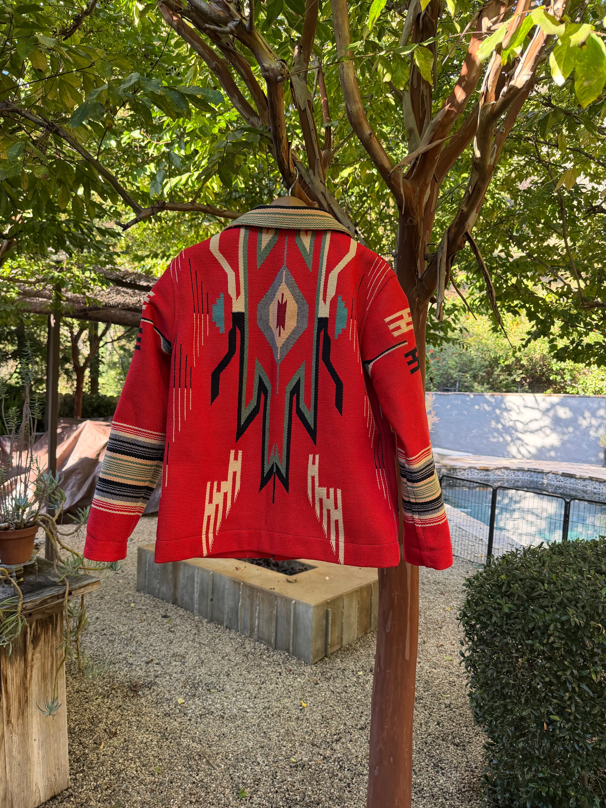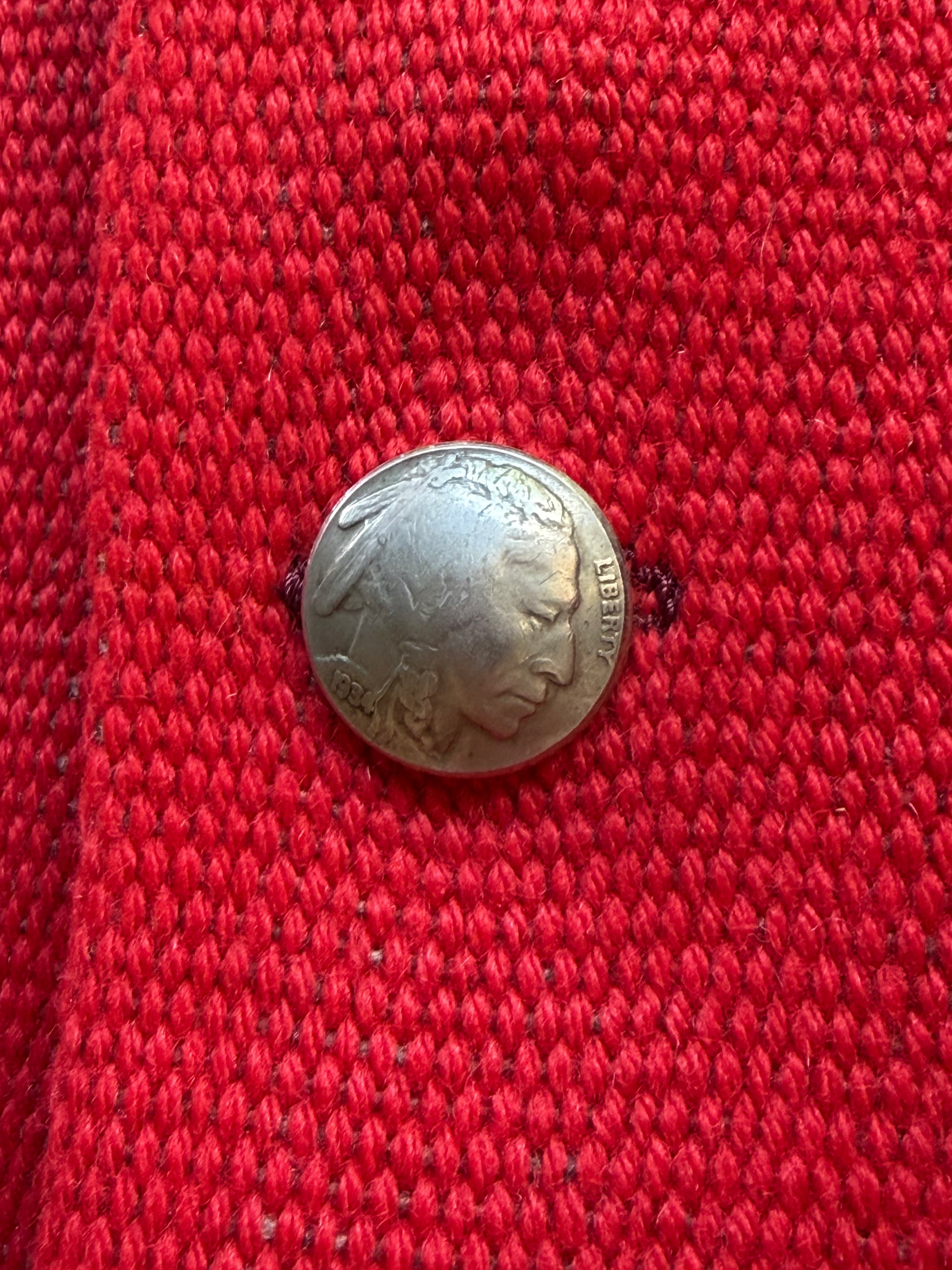 This Chimayo Wool Campfire Coat is a unique piece. This blanket is from New Mexico, and is at least one hundred years old. Real vintage domed Buffalo nickel buttons. Beautiful finish! Size medium. Impossible to repeat! Size medium.