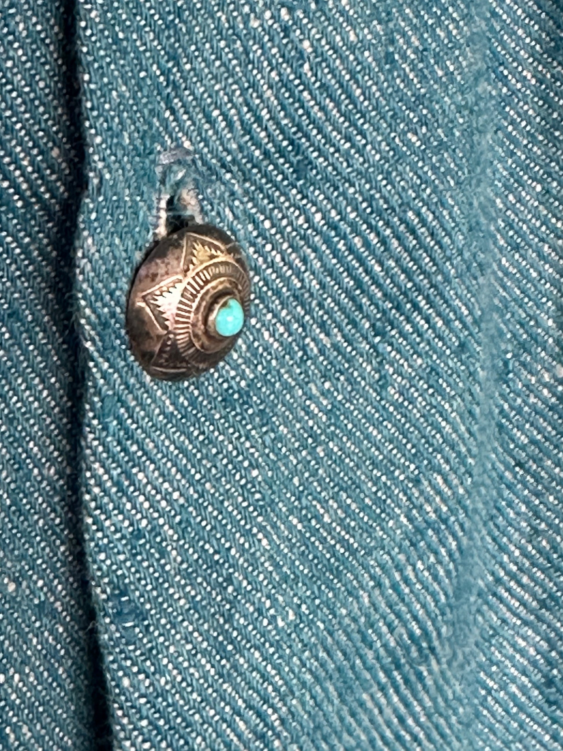 This shirt is crafted from wonderfully soft and light silk/cotton blend hand loomed fabric. Size is medium. 1940’s turquoise and sterling silver buttons.