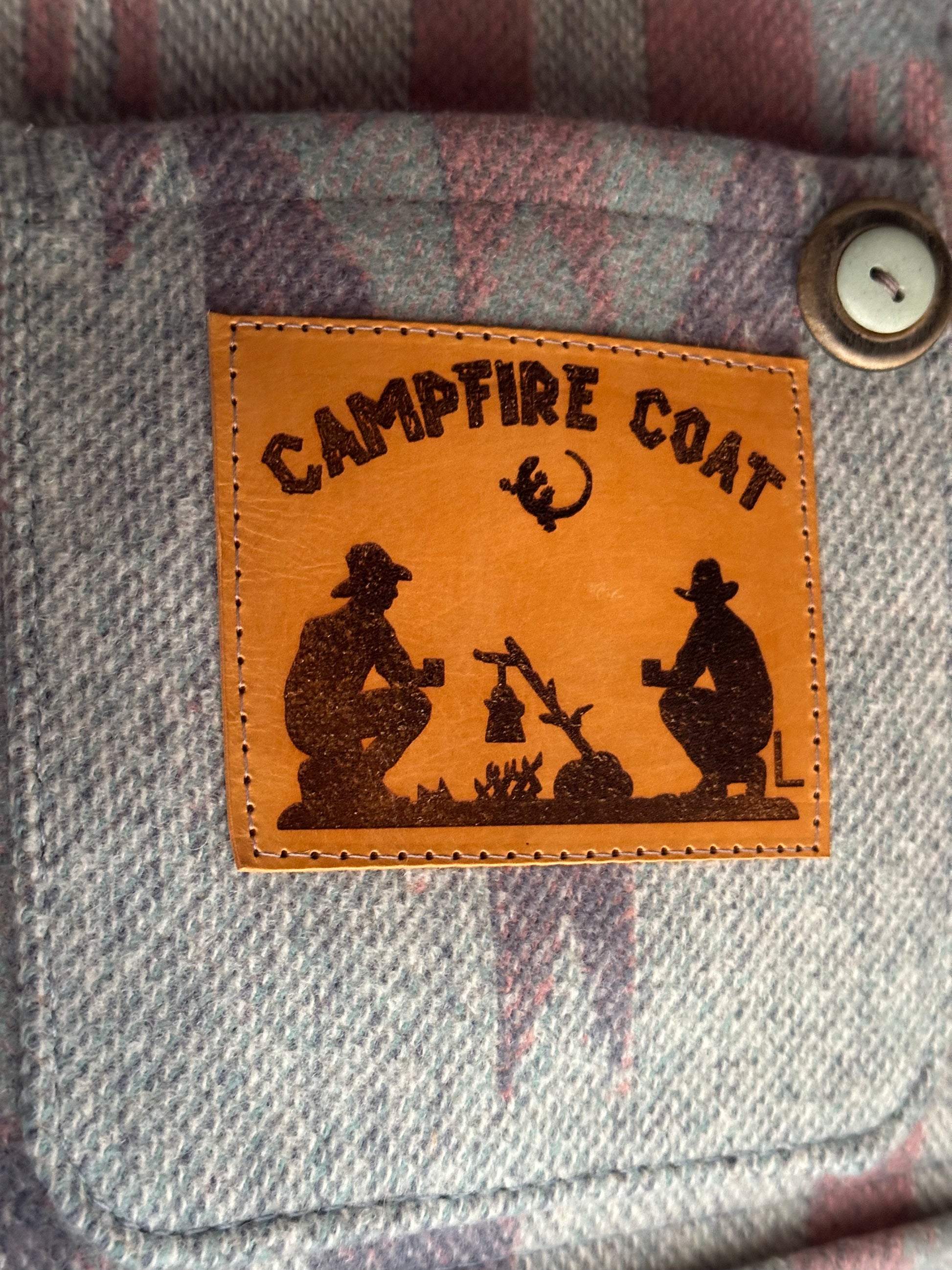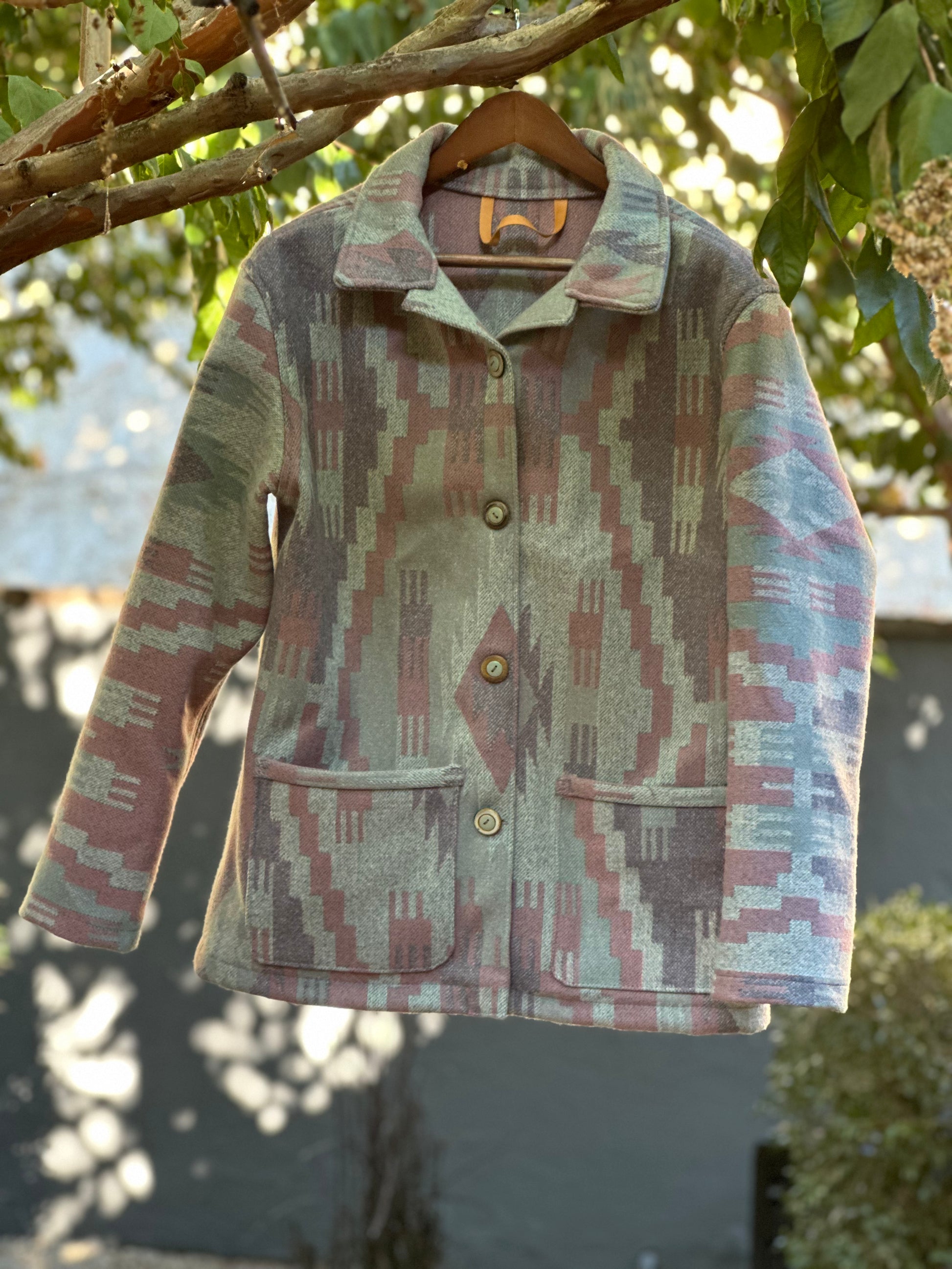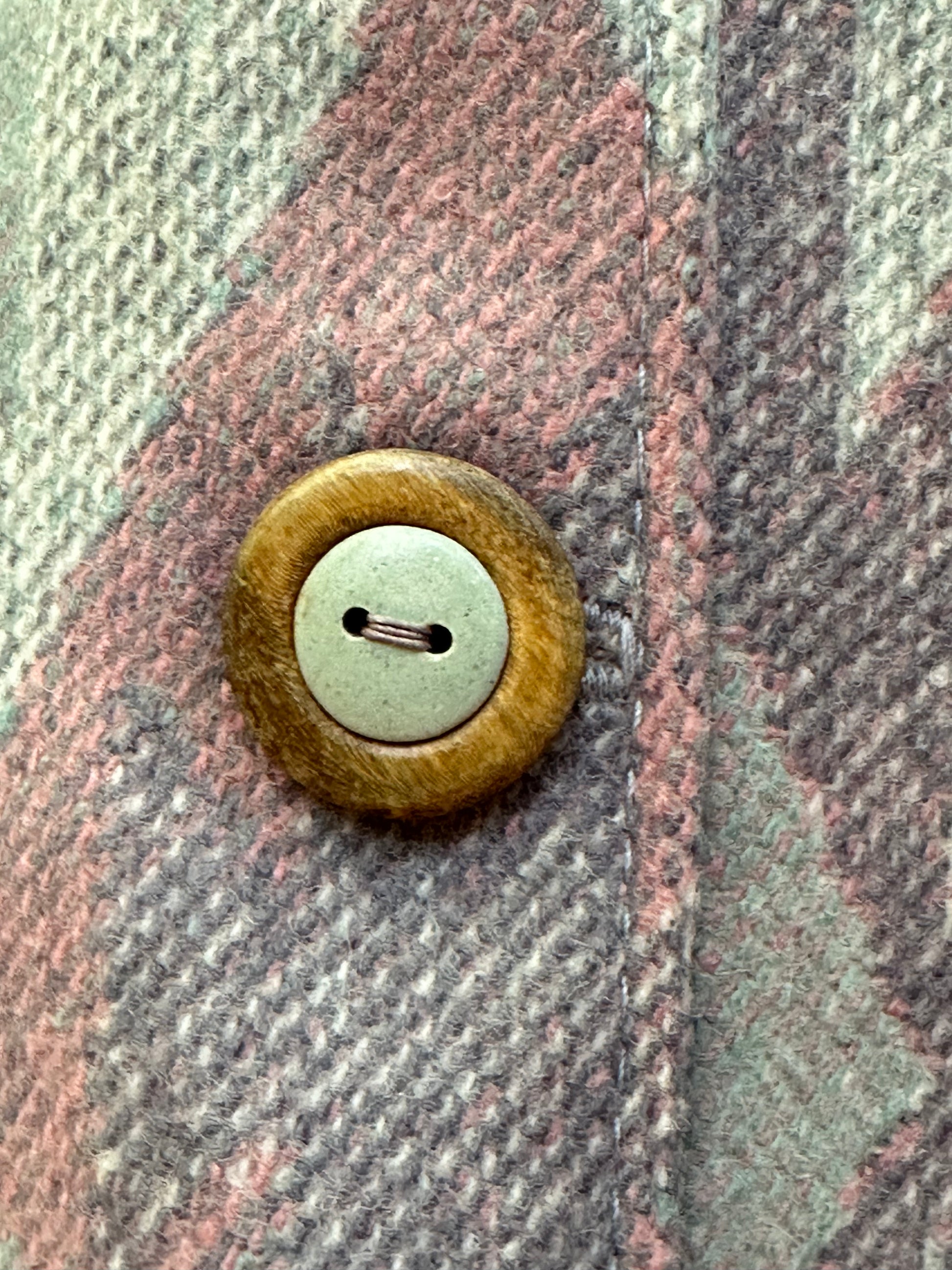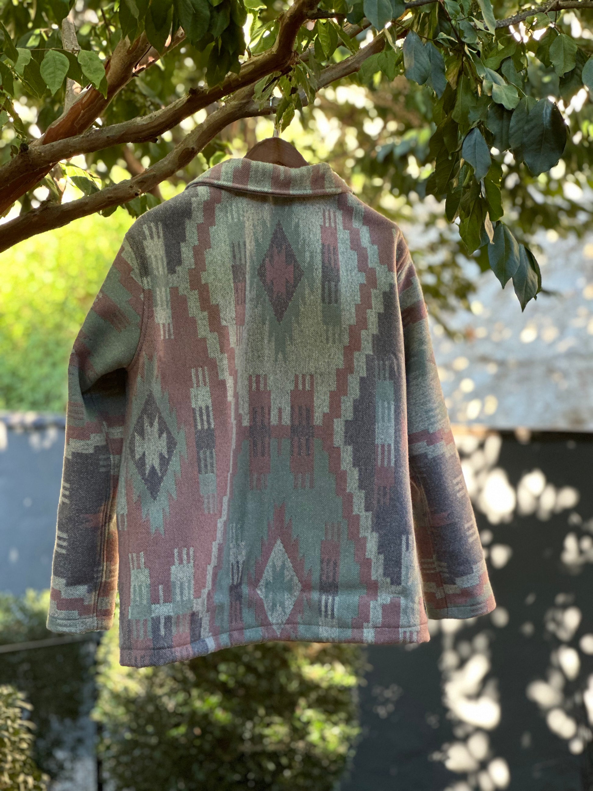 This Campfire Coat is crafted in 1960’s Jacquard woven wool, featuring pastel colors. Amazing vintage buttons. Size men’s large (women’s XL). Study yet soft. Two pockets on the outside, one on the inside.