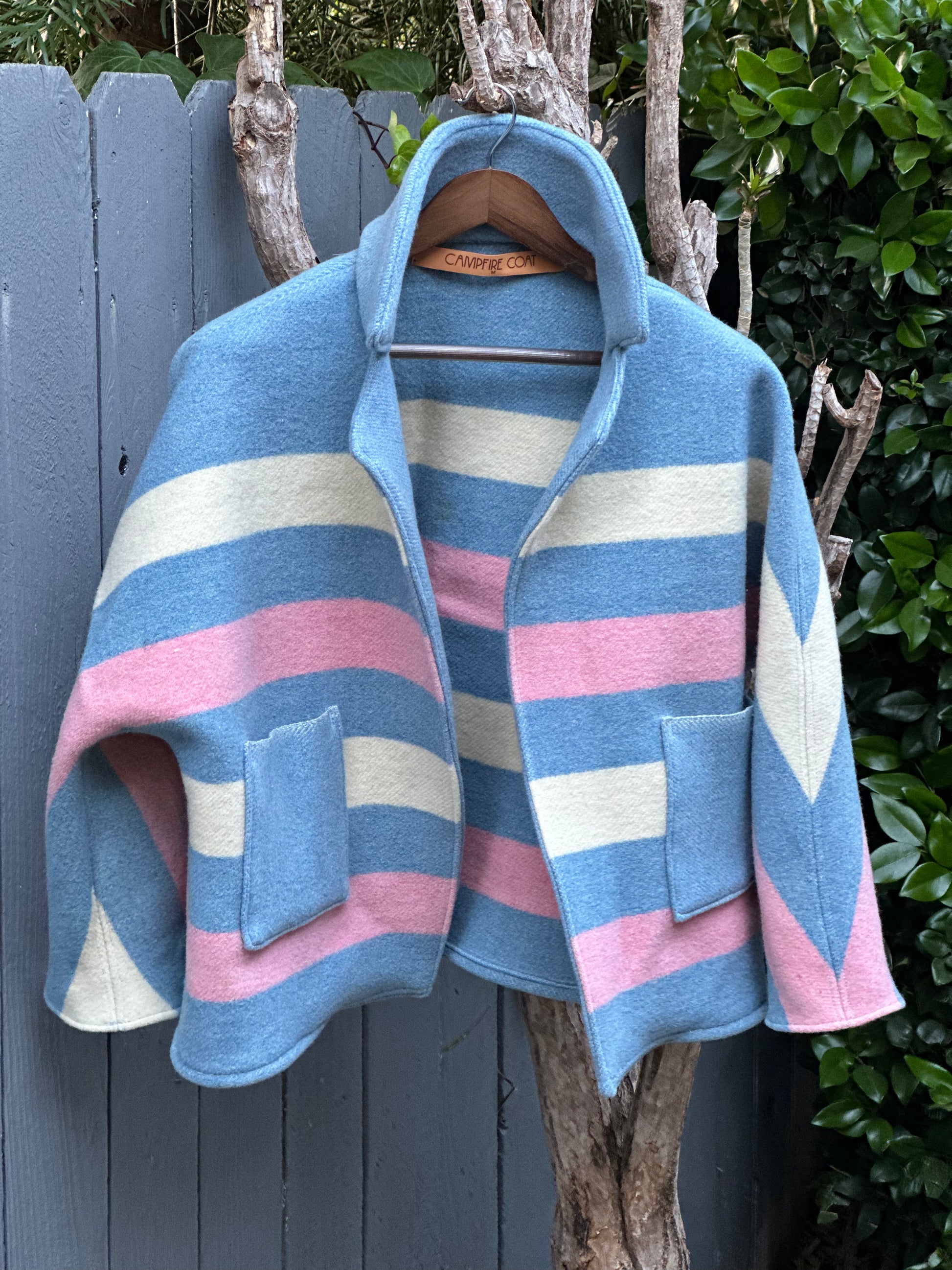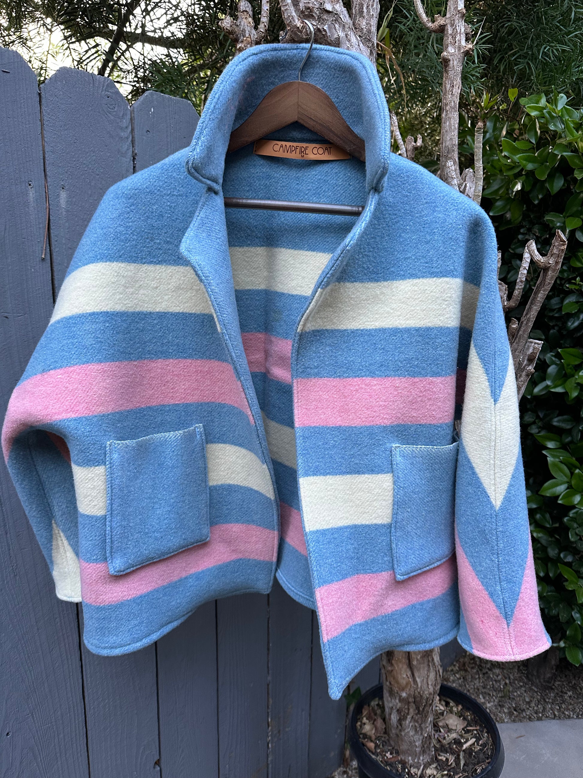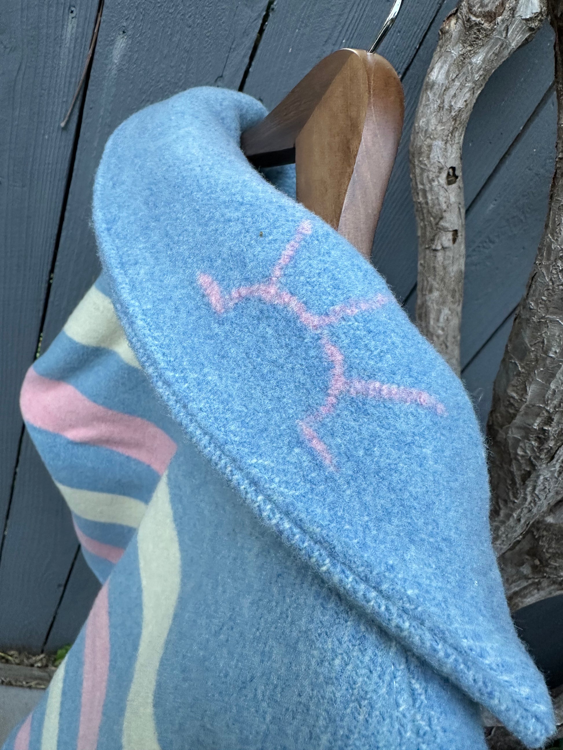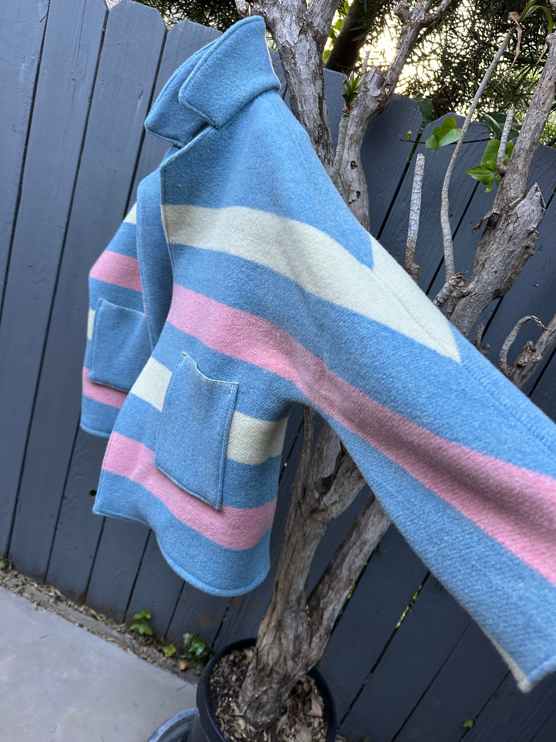 This is an exceptional MCM American Jaquard Wool Campfire Coat. Medium Women’s size. Crafted from a 1950’s-1960’s blanket. Wonderful material, excellent condition. No buttons, two exterior pockets. I loved the simplicity without, but could add buttons if you would prefer. Size is woman’s medium. Loose fit with ragland shoulders. One of one!