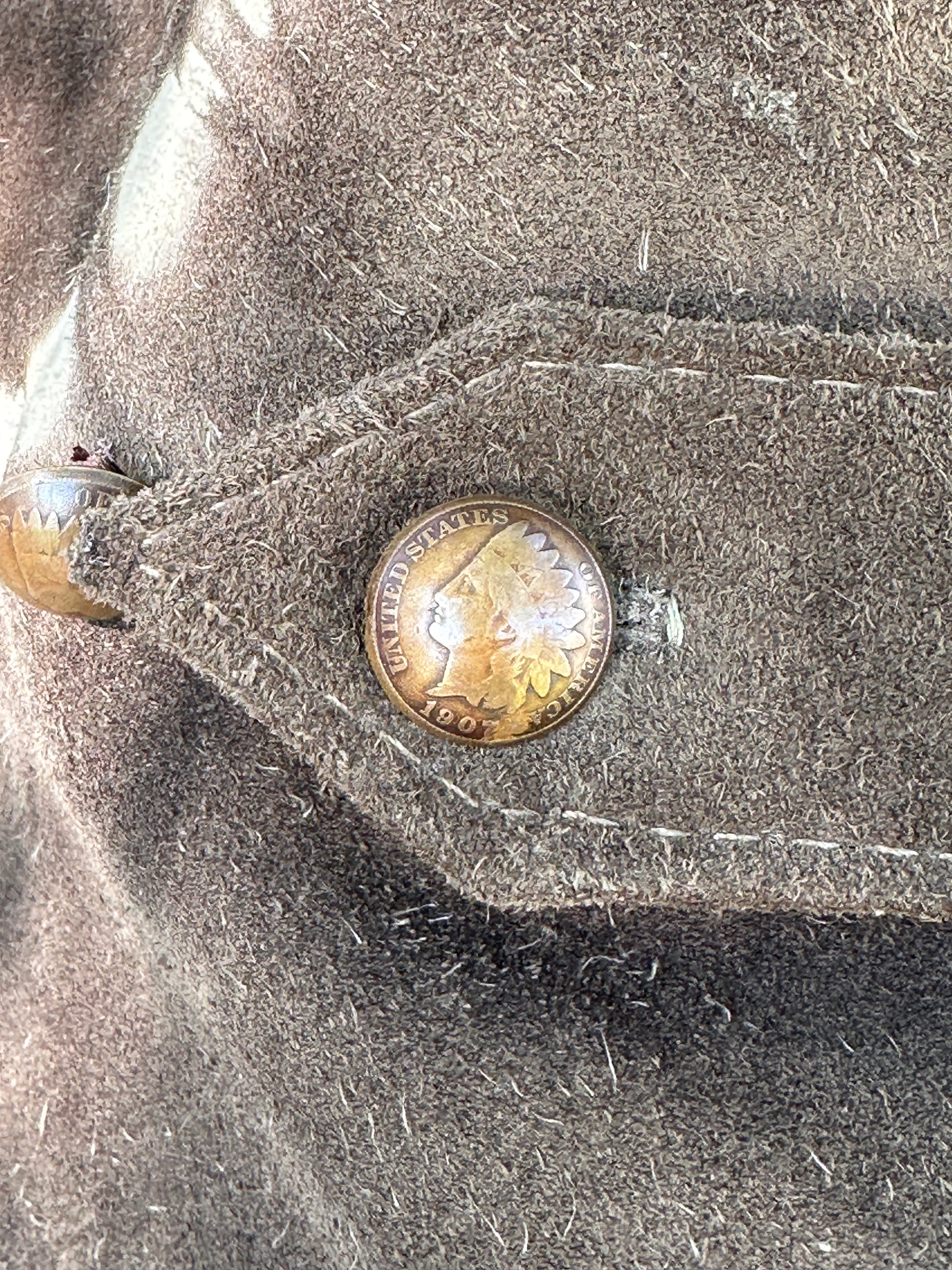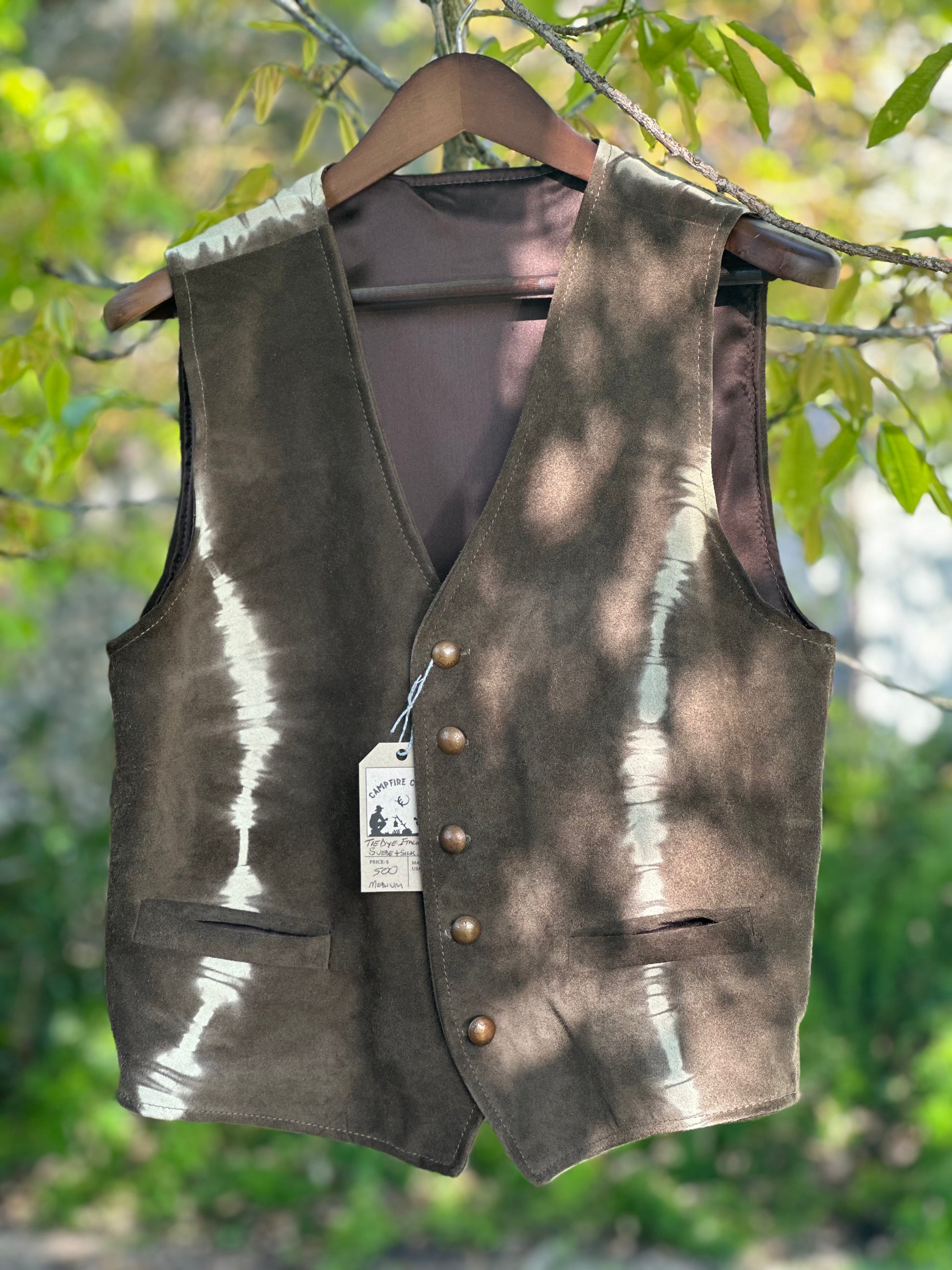 This Olive Italian Suede Vest has been tie dyed. Welted pockets. Lined in fine silk. Cooper penny buttons. One of one! Size medium