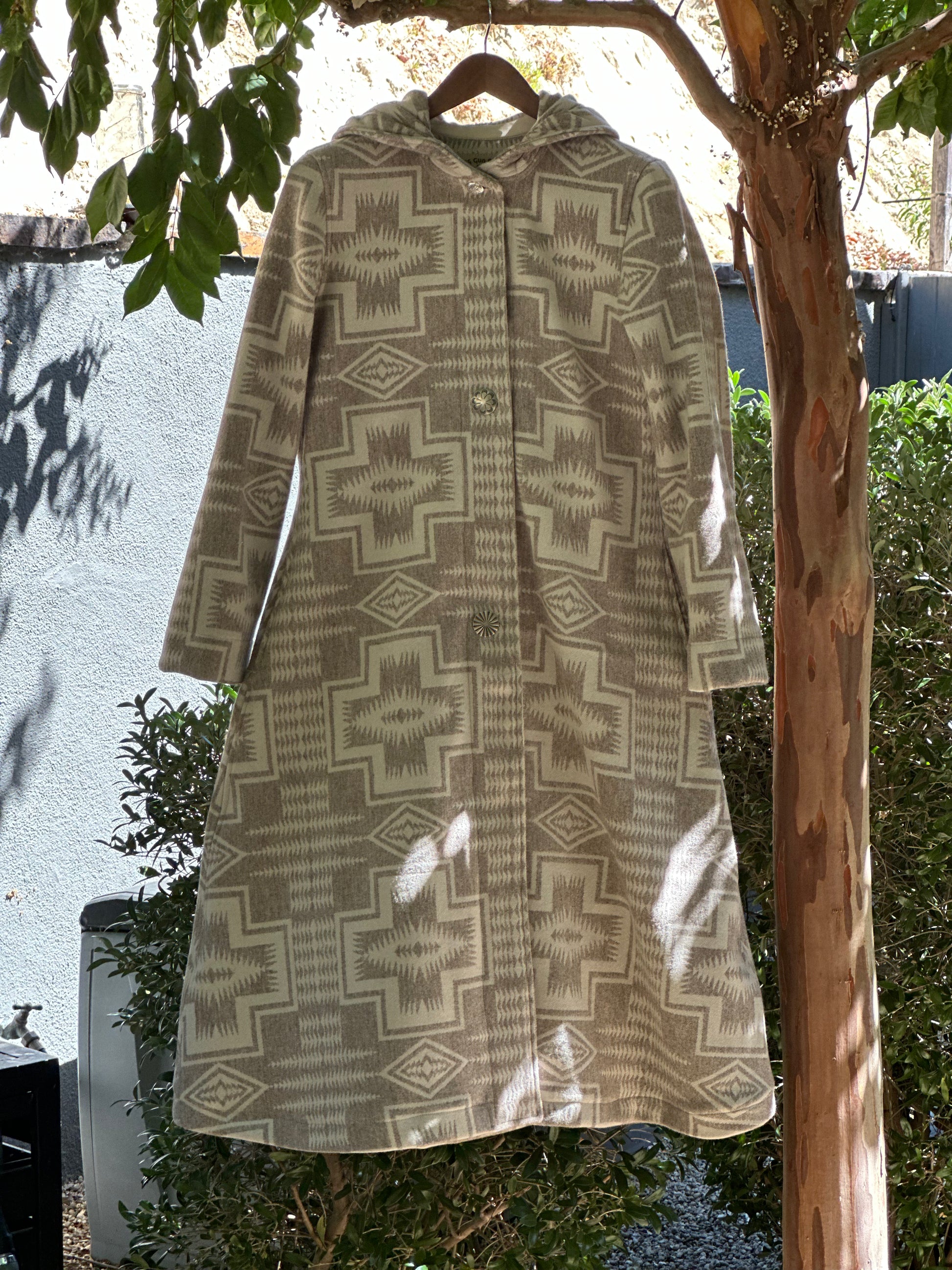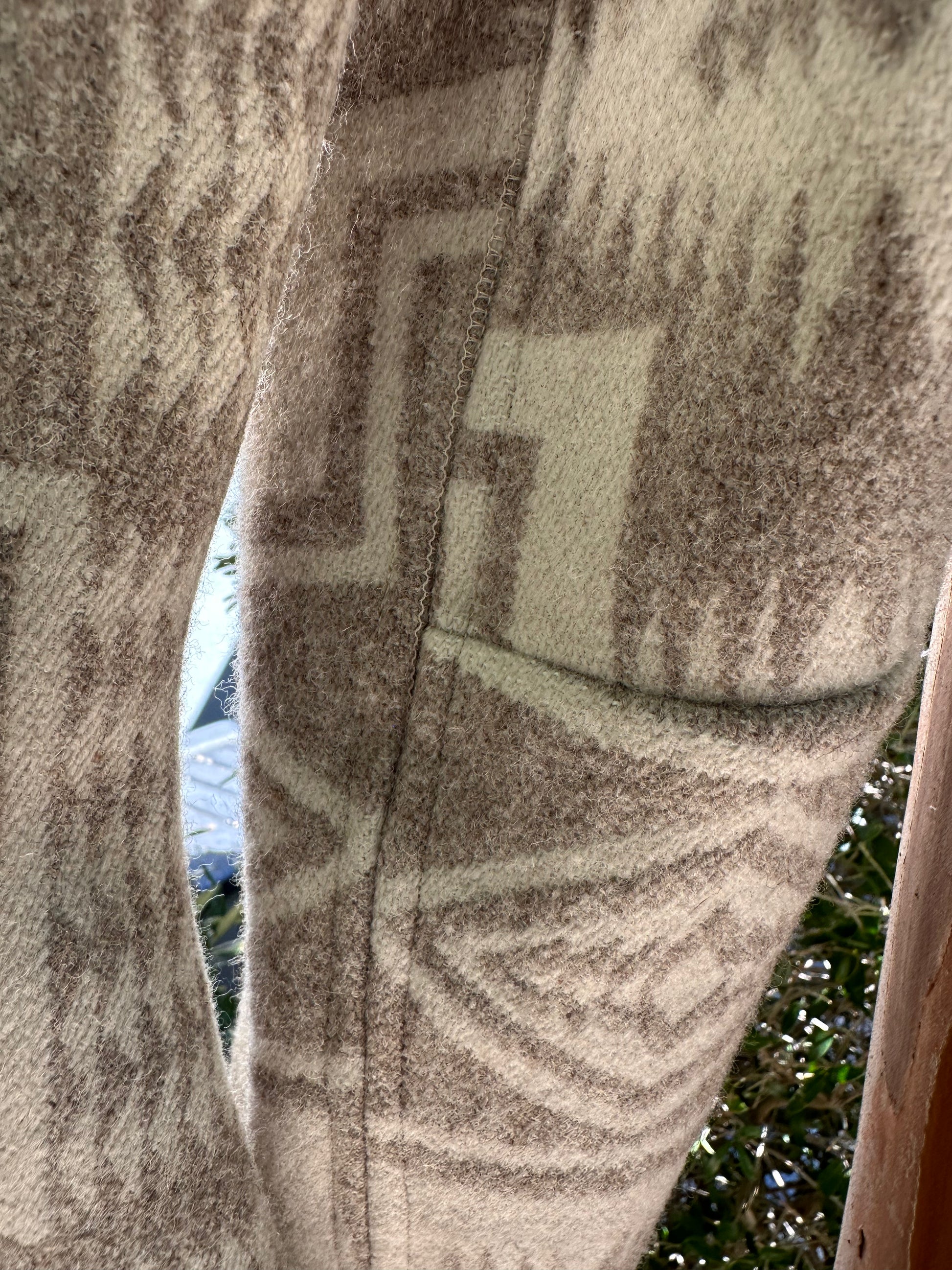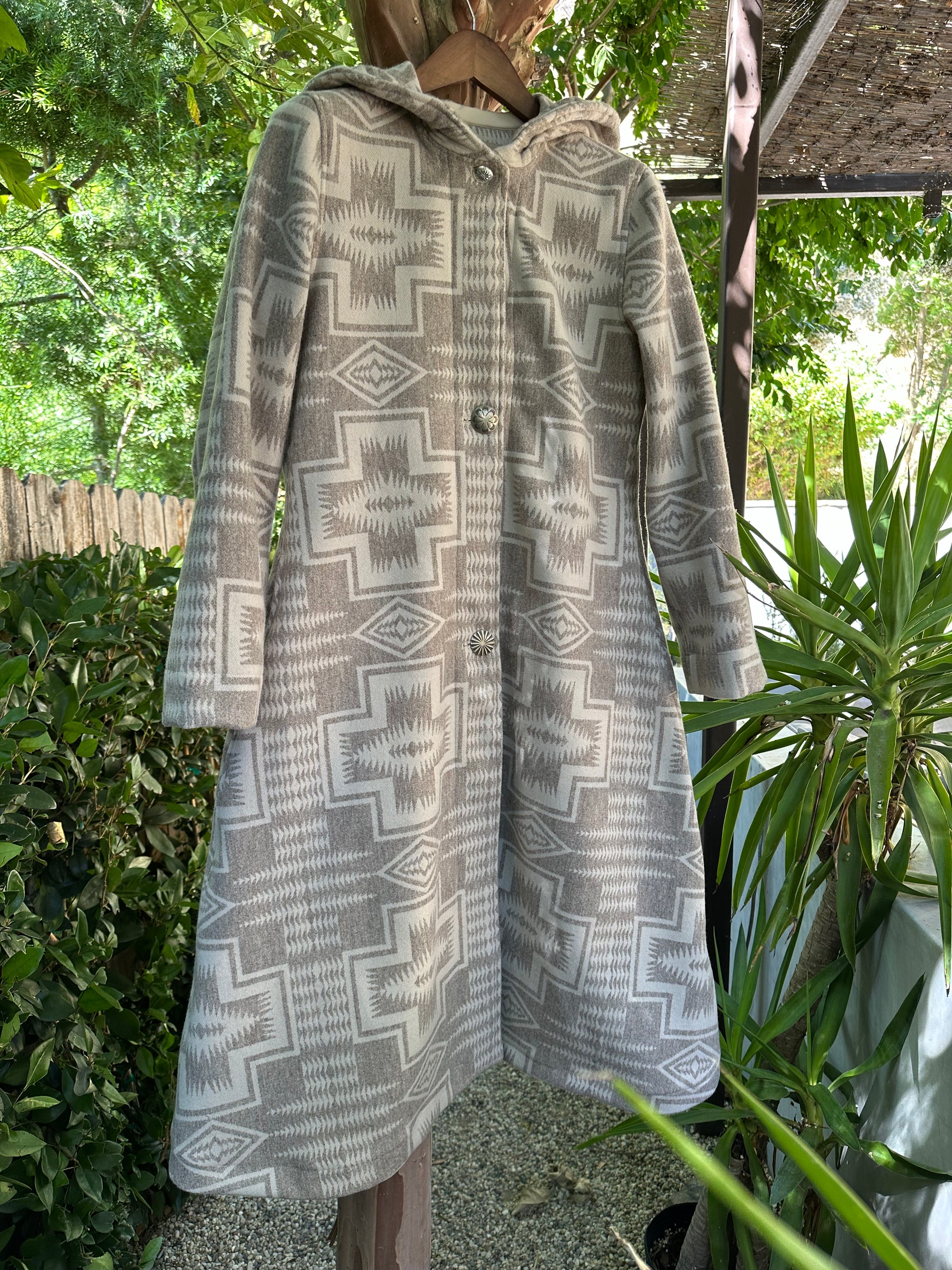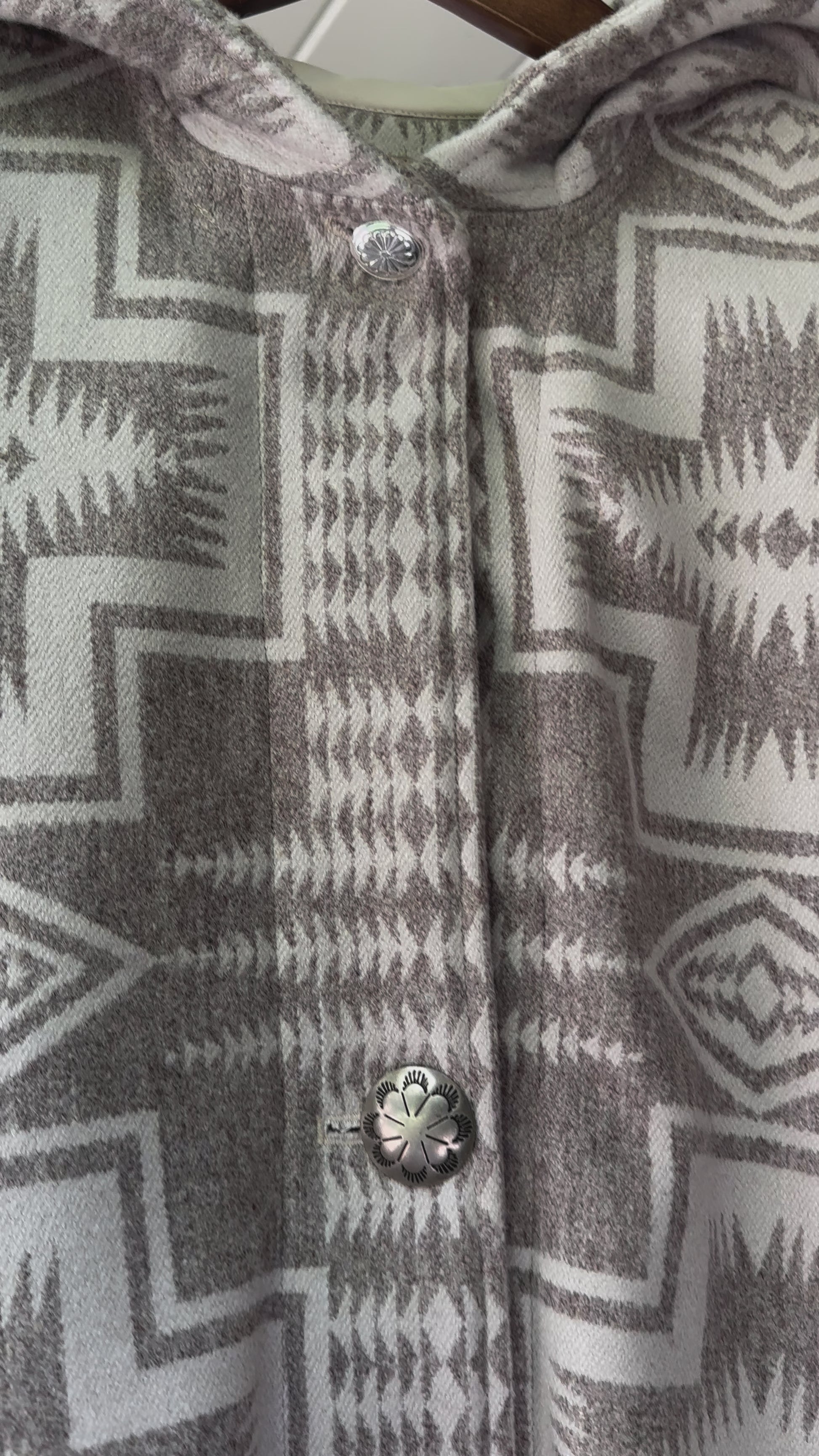 Everyone looks great in this cut! Great drape and shape, with a bell-bottom that flows. Makes you want to dance! This example is made using new Pendleton® Tonal Tan Harding Jacquard woven wool. Functional hood, hidden side seam pockets. This one has three vintage sterling silver buttons from the 1930’s. Size is ladies medium.