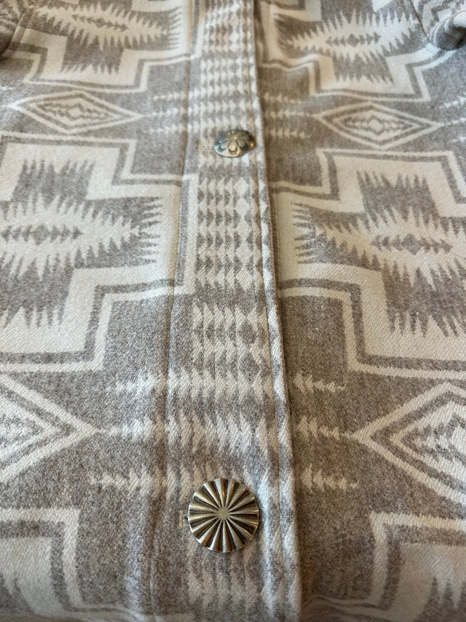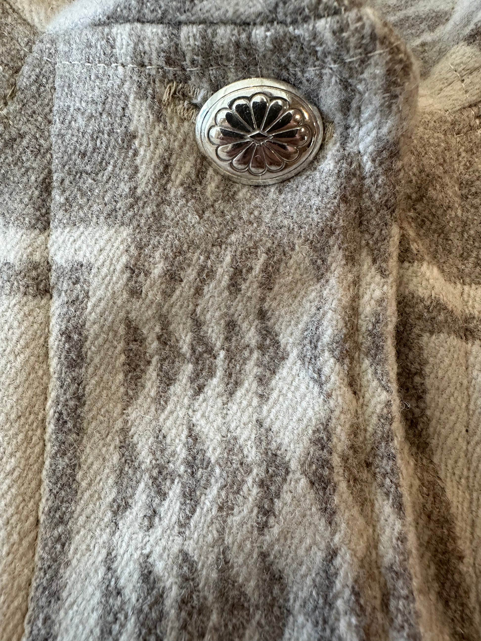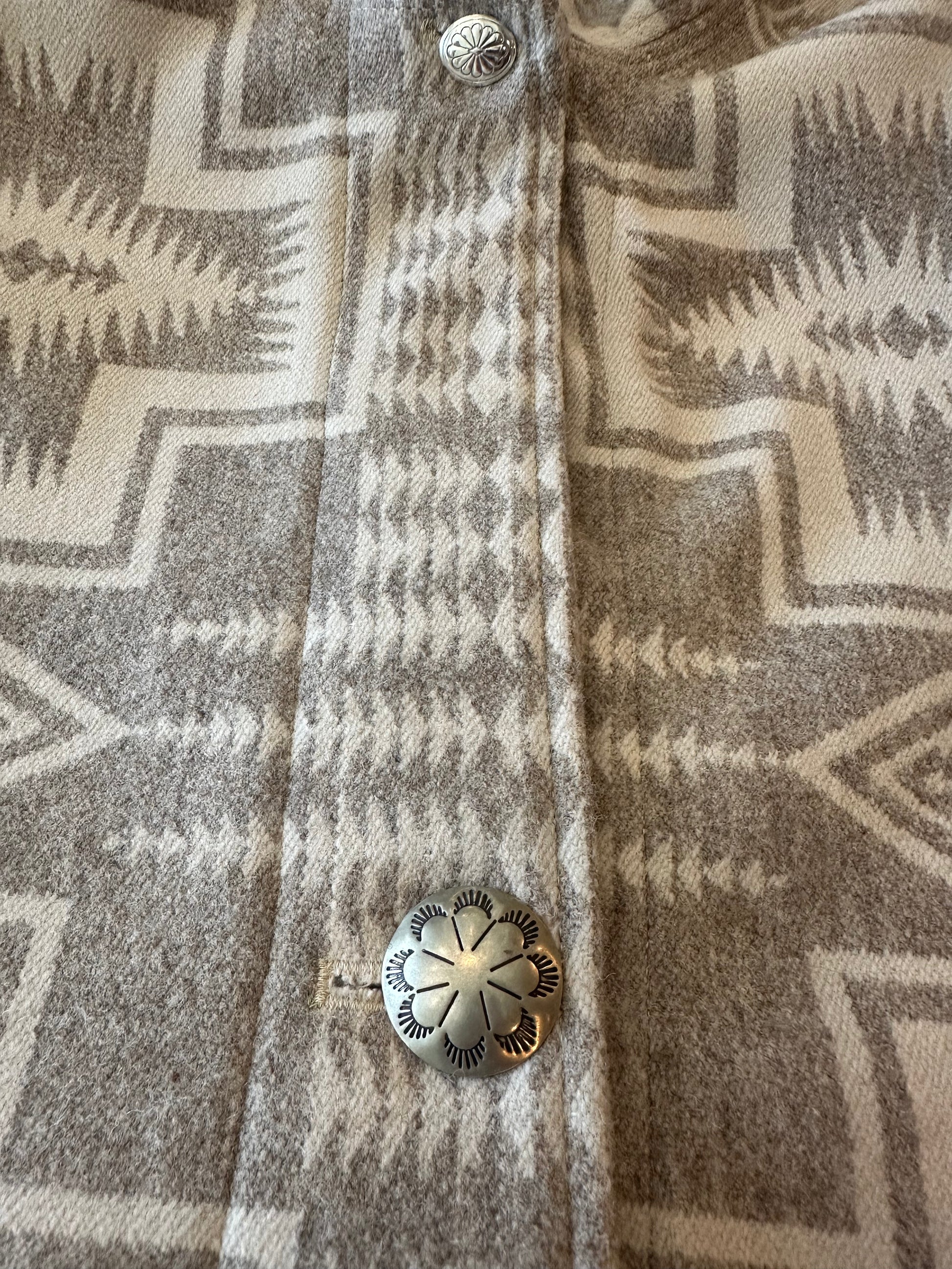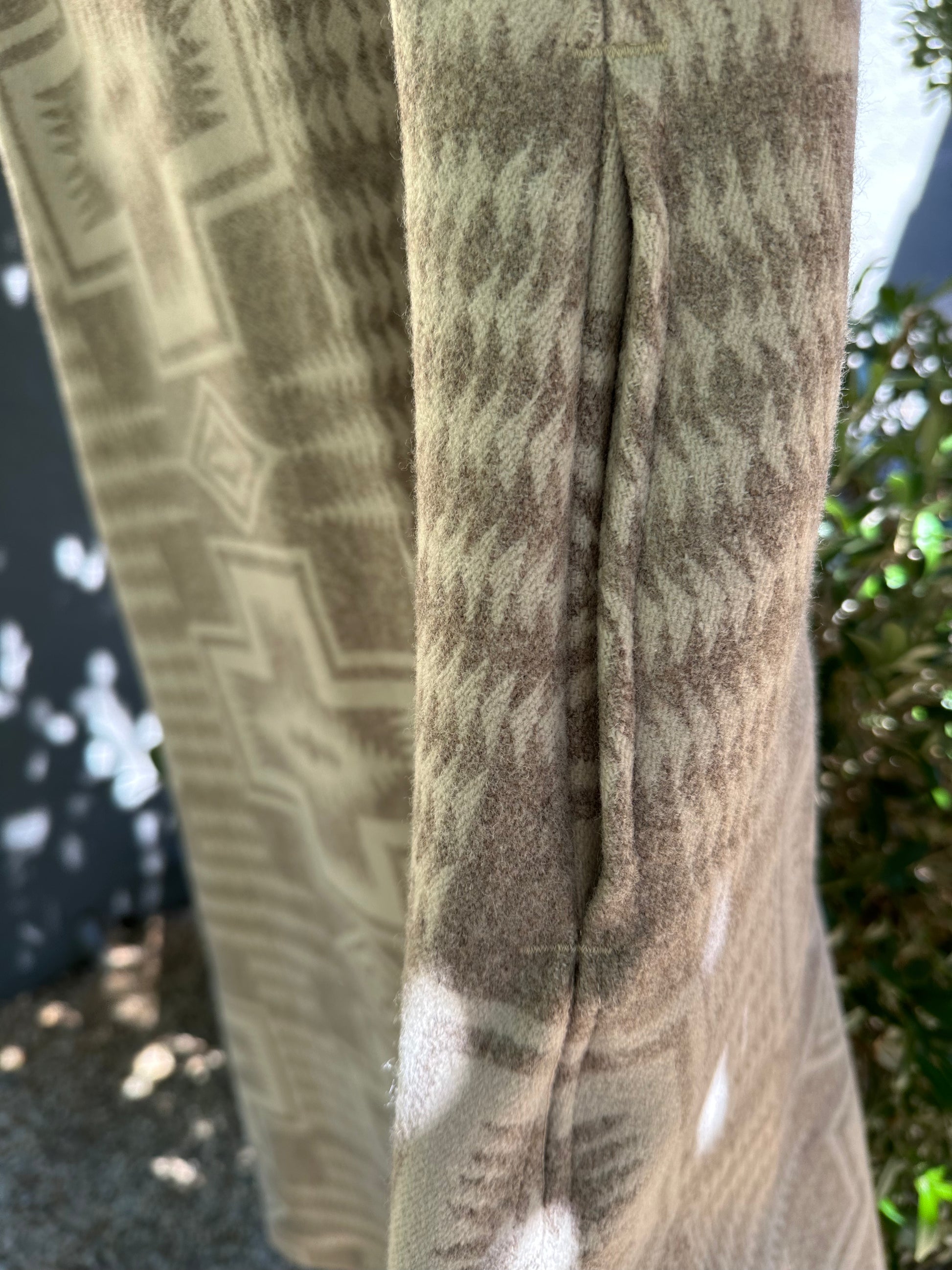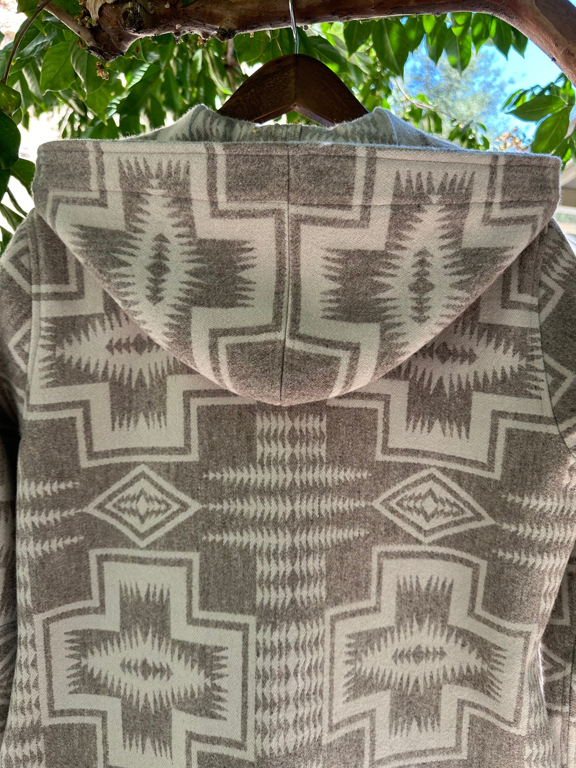 Everyone looks great in this cut! Great drape and shape, with a bell-bottom that flows. Makes you want to dance! This example is made using new Pendleton® Tonal Tan Harding Jacquard woven wool. Functional hood, hidden side seam pockets. This one has three vintage sterling silver buttons from the 1930’s. Size is ladies medium.
