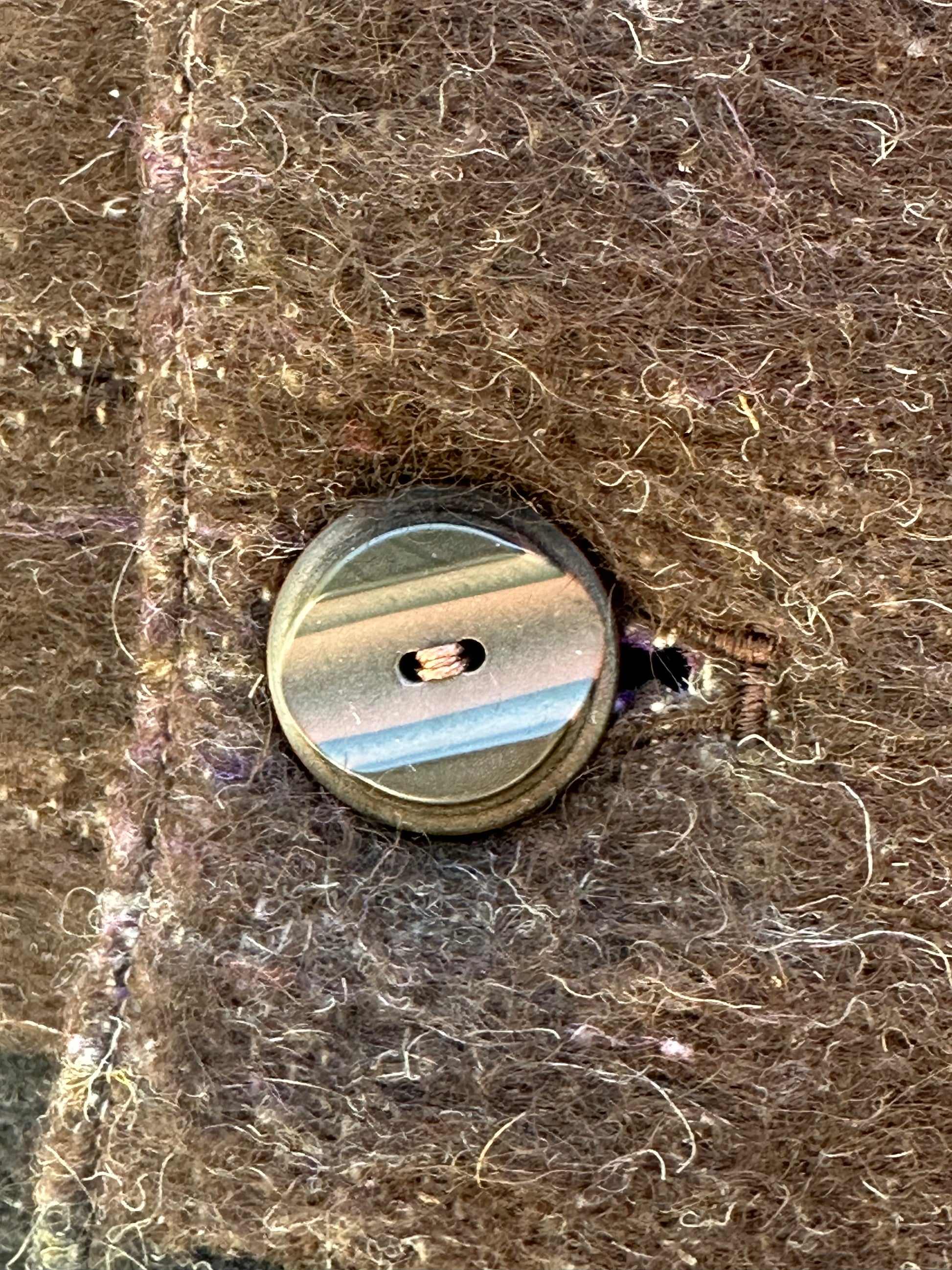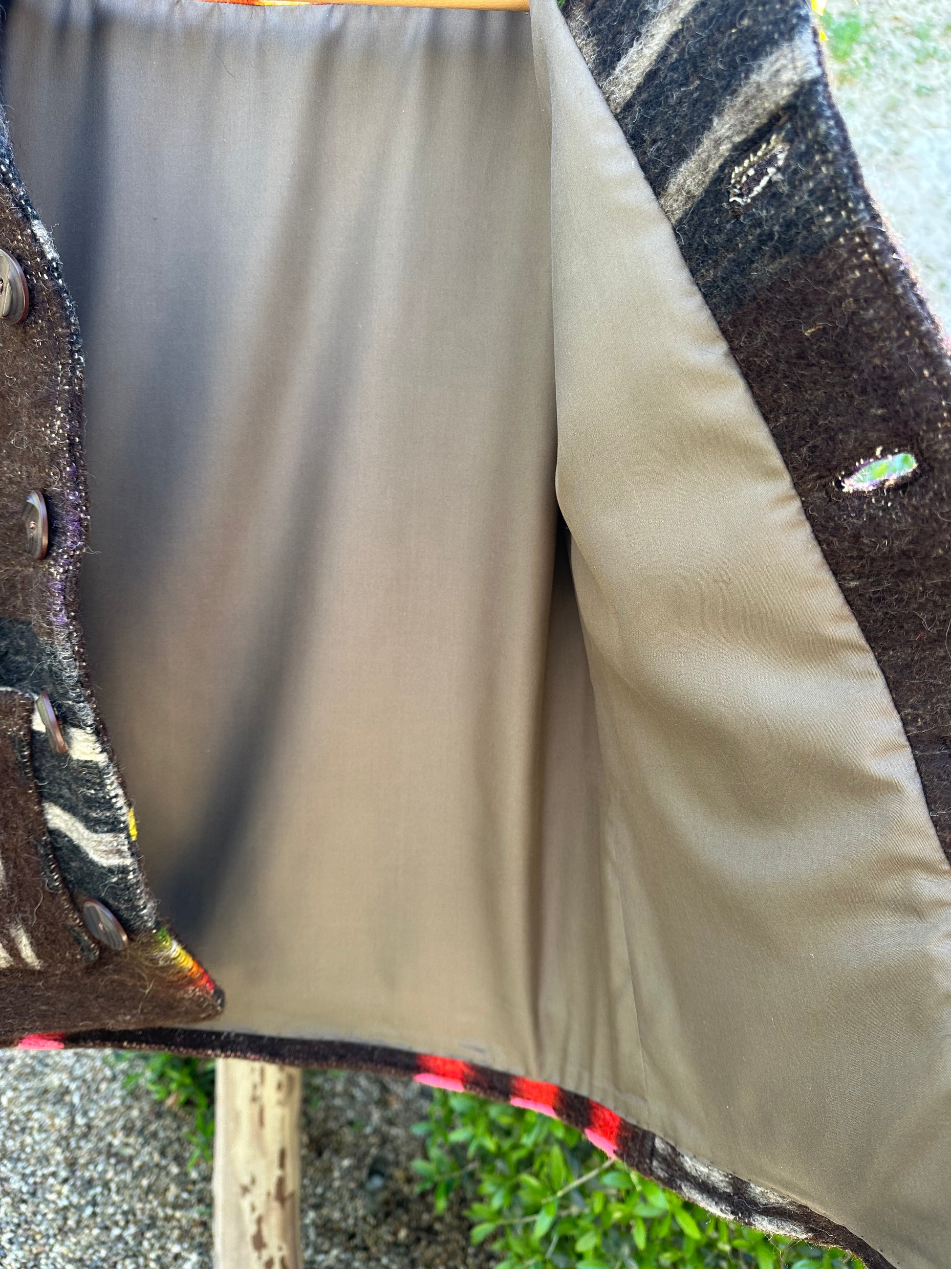This Pre-WW2 Jacquard Wool Blanket Campfire Coat is a unique piece. Vintage buttons, silk lining. This is a very rare, hand made blanket! Nice and thick, epic patina. Size medium.