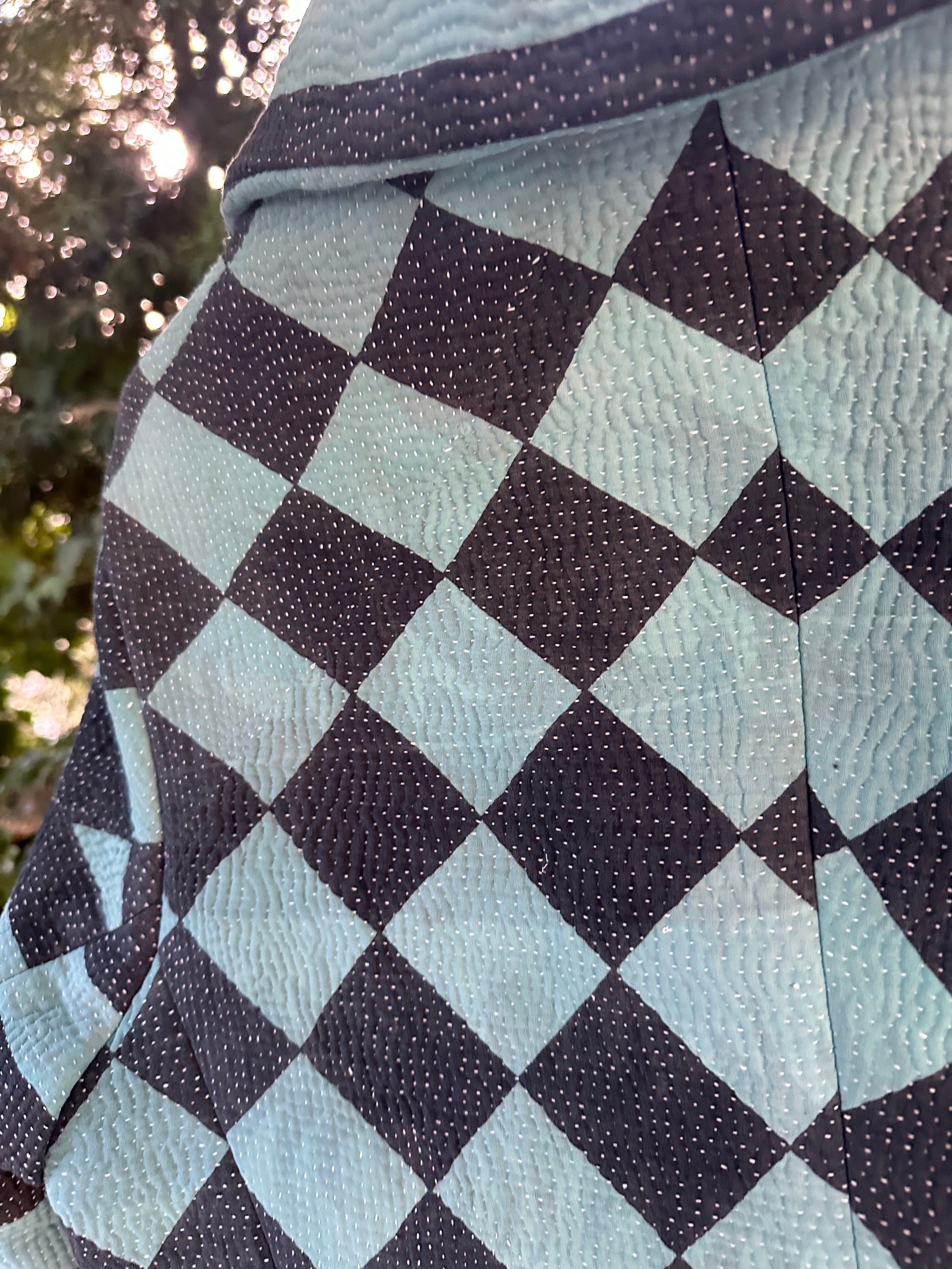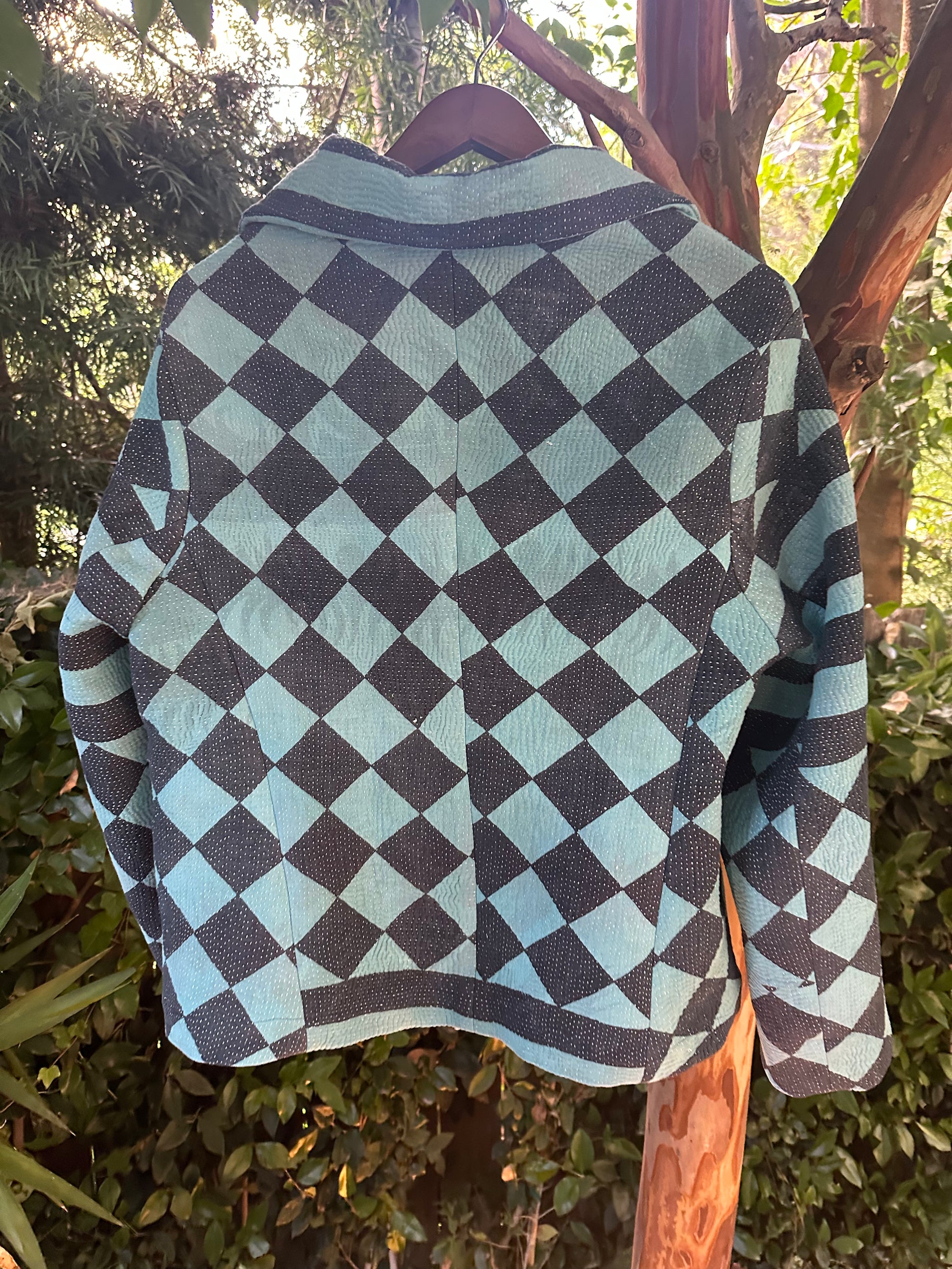This is an exceptional Vintage Indian Cotton Kantha Blanket Campfire Coat. Size is Medium. Wonderful material, excellent condition. Large vintage buttons, one inside pocket. This is not some trashy, cheap Kantha. Exceptional quality, dense weave and super comfy. One of one! Pale blue and black, great patina and fade, white threads, hand stitched, multiple layers.